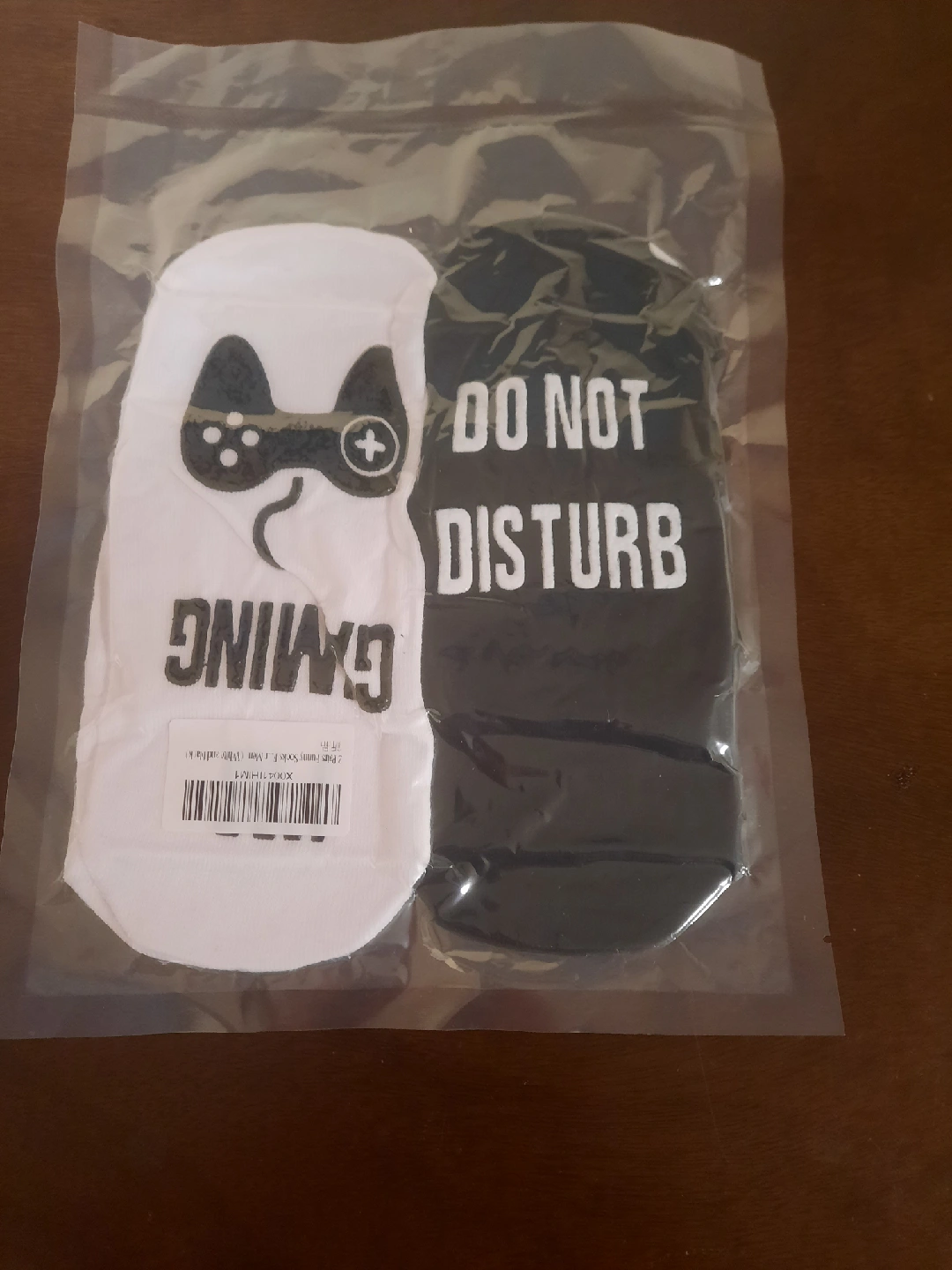 Selling a set of two pairs of fun socks! One pair is white with a gaming controller design and the word 'GAMING'. The other pair is black and says 'DO NOT DISTURB'. Perfect for gamers or anyone who wants to relax!