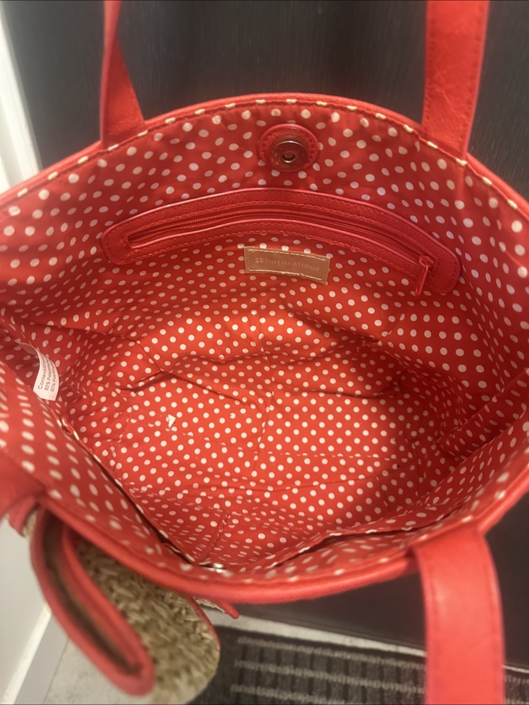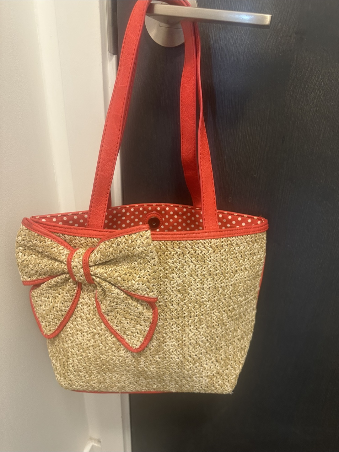 *EUC* Super cute straw purse! It features a bow on the front and lined with a coral and white polka dot interior. 3 interior pockets, including one zipper. There is a magnetic closure to secure the bag. Can be worn on the shoulder or as a handbag