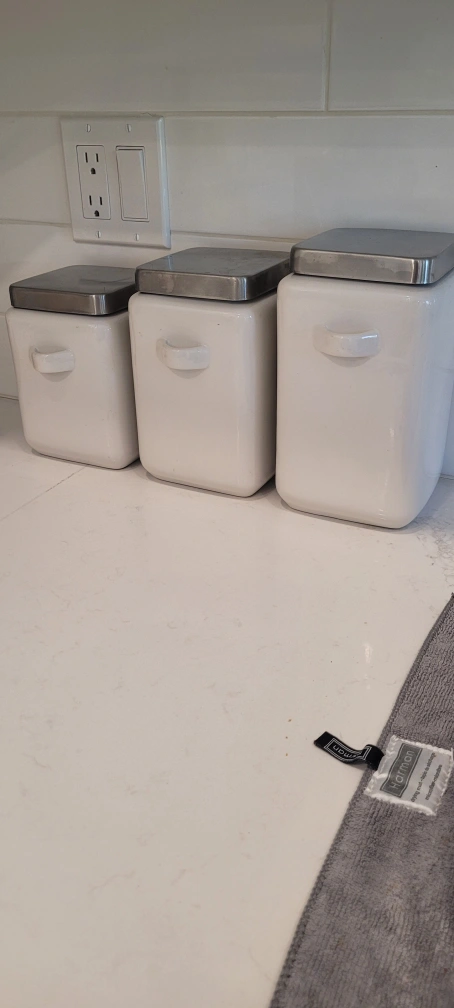 I'm selling a set of three white ceramic canisters. They have a simple, modern design with stainless steel lids and small handles on the front. They would look great in any kitchen!