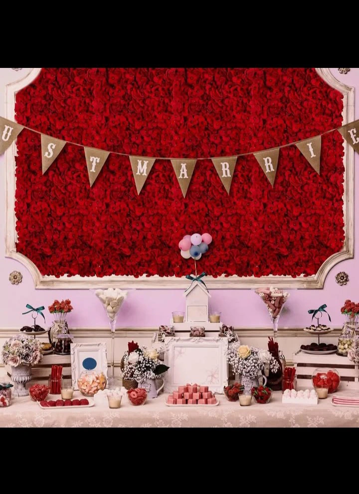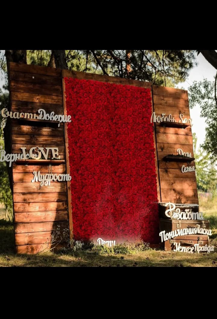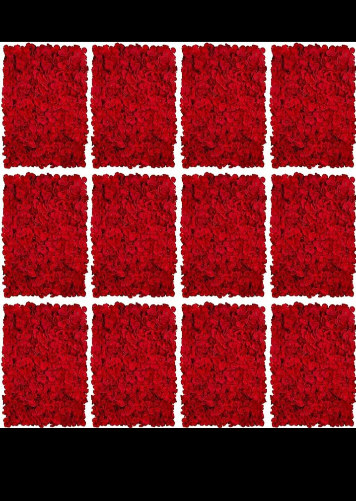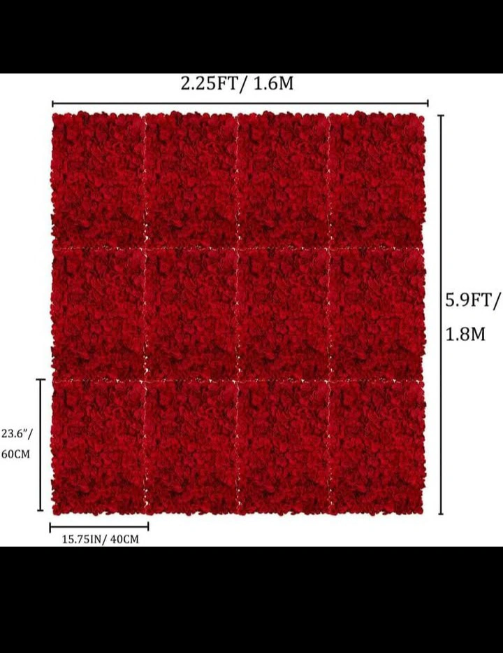 Selling a beautiful red artificial flower wall panel backdrop. These panels can be used to create stunning backdrops for events like weddings or parties. The dimensions of each panel are approximately 15.75 inches by 23.6 inches. They can be easily fastened together using zip ties (included) to create a larger wall.