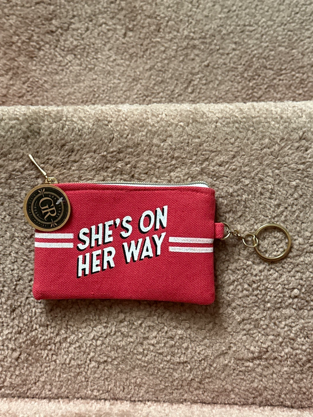 A cute little red pouch from GR Inspired! It has the phrase "She's On Her Way" printed on the front. Perfect for carrying small items or as a fun accessory, key chain, coin purse.