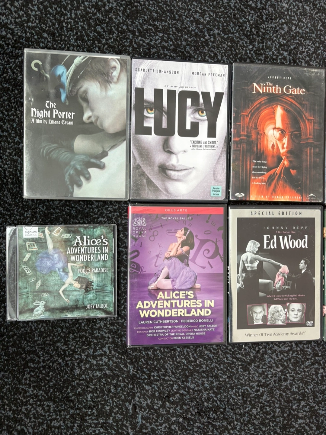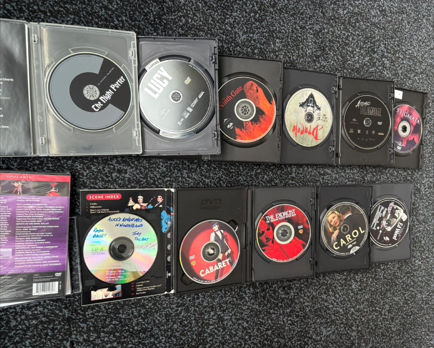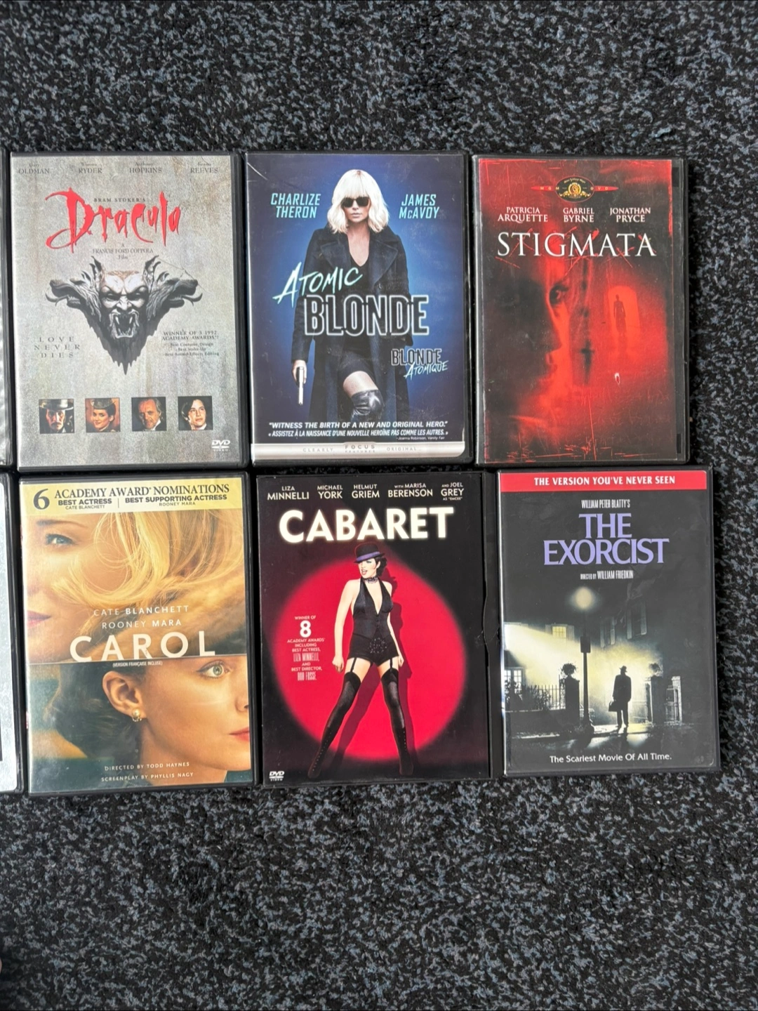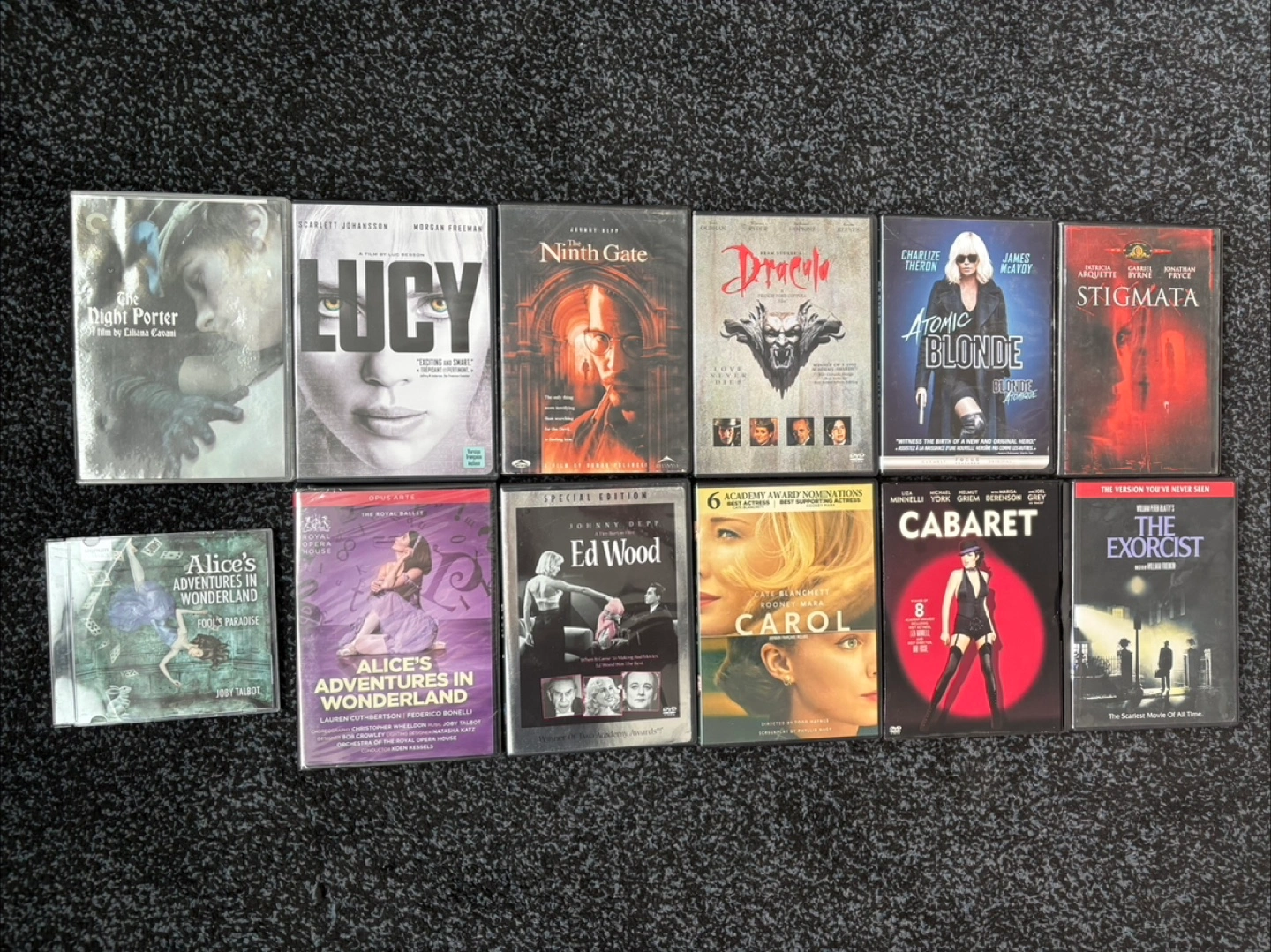 *I do not ship. Must come to me for pickup. Cash only.* Asking $40 for all, or $5 per DVD. Selling a collection of DVDs, including dramas, thrillers, and ballet performances! Titles include Lucy, Ninth Gate, Dracula, Atomic Blonde, Stigmata, Carol, Cabaret, The Exorcist, The Night Porter, Alice's Adventures in Wonderland, and Ed Wood. All opened except for “Alice’s adventures in wonderland” ballet. No refunds.