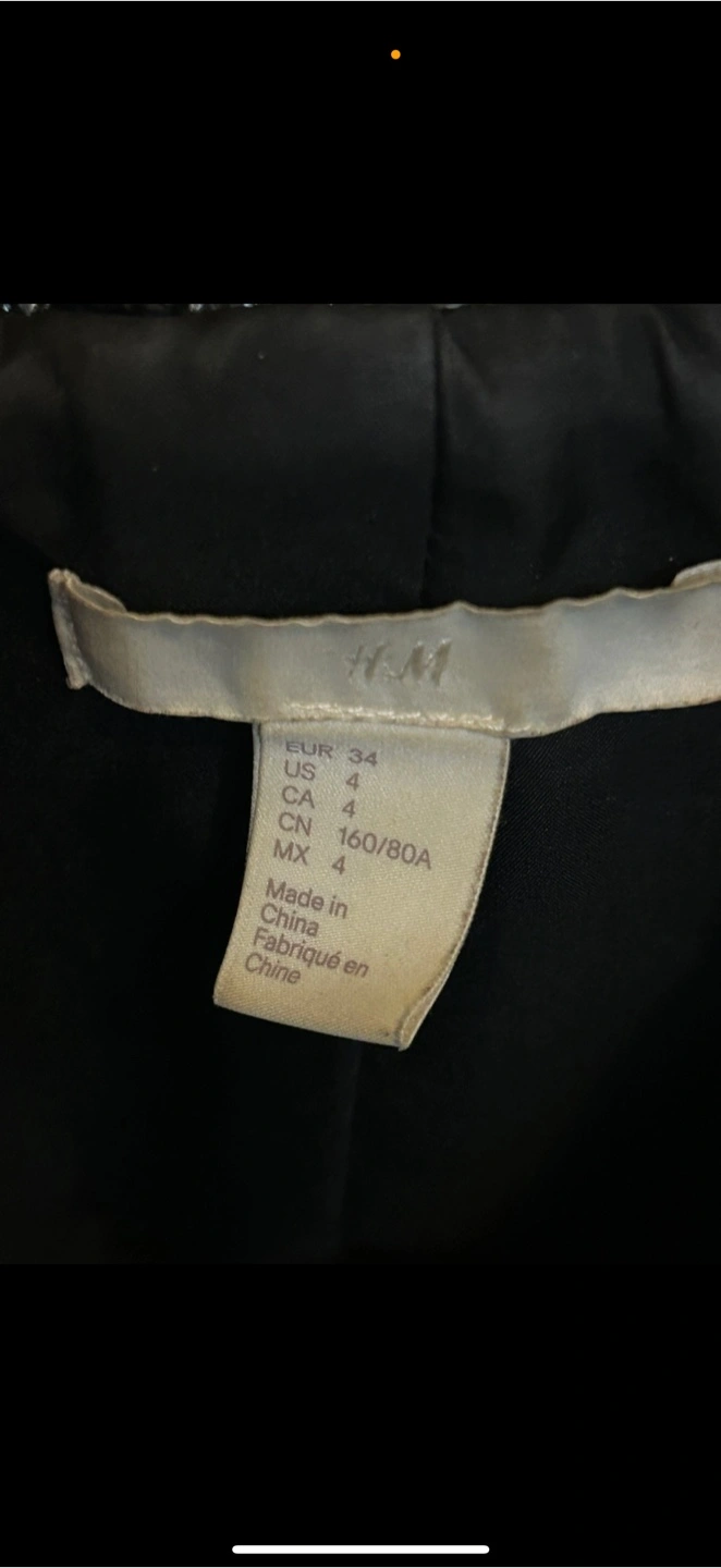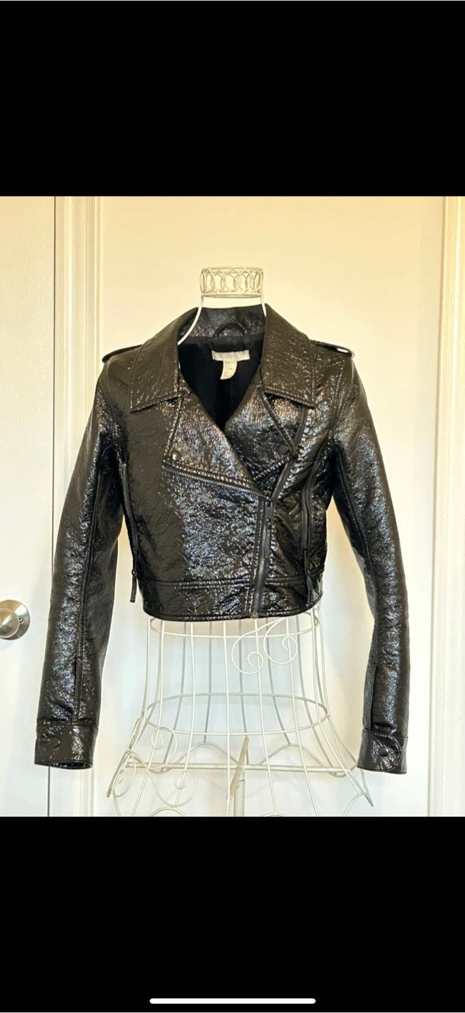 Selling a stylish H&M moto jacket in a sleek black brownish faux patent leather finish. It's a size 4 and perfect for adding a bit of edge to any outfit!