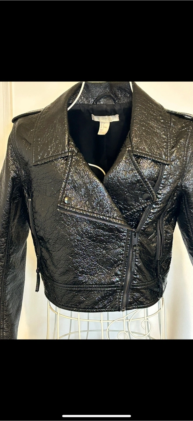 H&M Black Faux Patent Leather Moto Jacket - Size 4