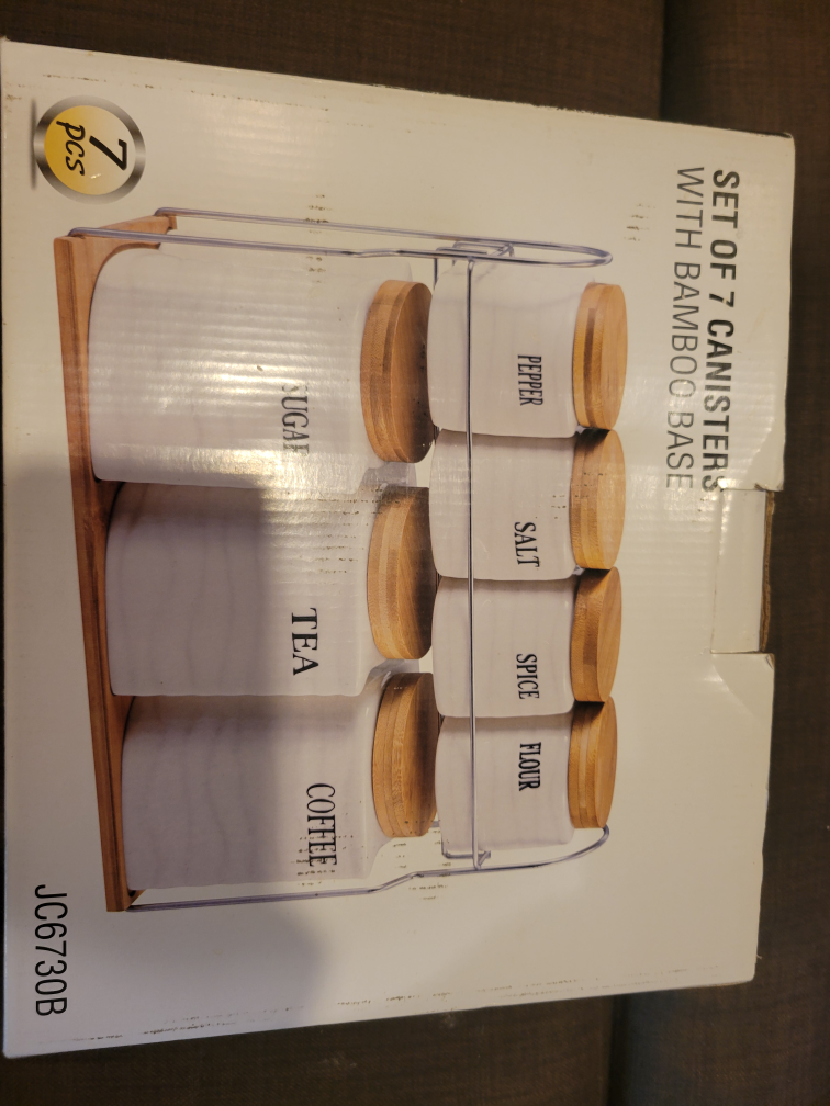 Set of 7 ceramic cannisters with bamboo lids and base.