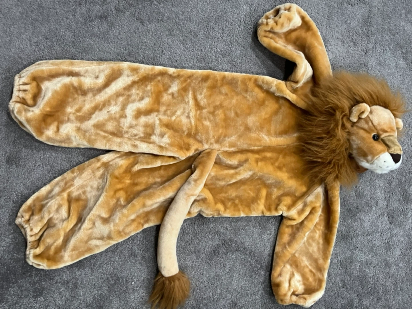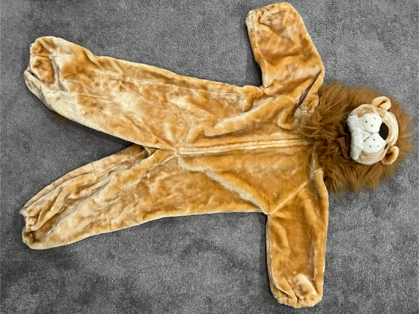 A cute lion costume for kids! It's in great condition and perfect for dress-up or Halloween. It's a soft, plush material and features a lion's head hood and tail