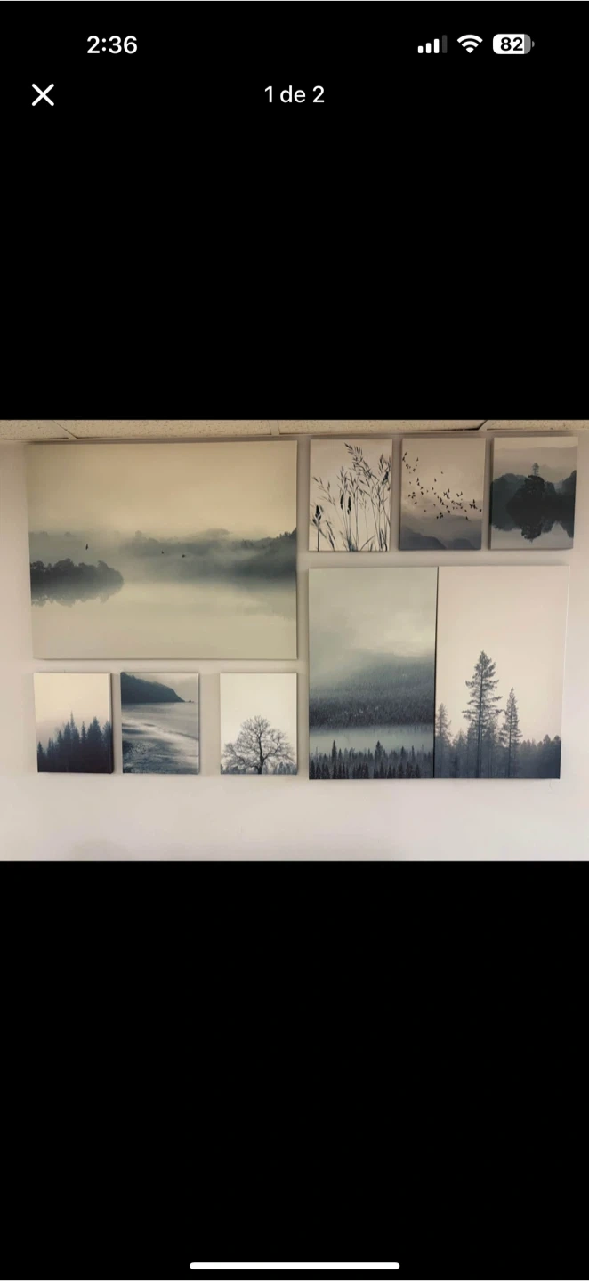 IKEA MYRKDALEN wall decoration set for sale! This set includes 10 pieces with beautiful nature-themed prints. The overall dimensions are 179 cm (70 1/2 ") in width and 112 cm (44 ") in height. Perfect for adding a touch of serenity to any room
