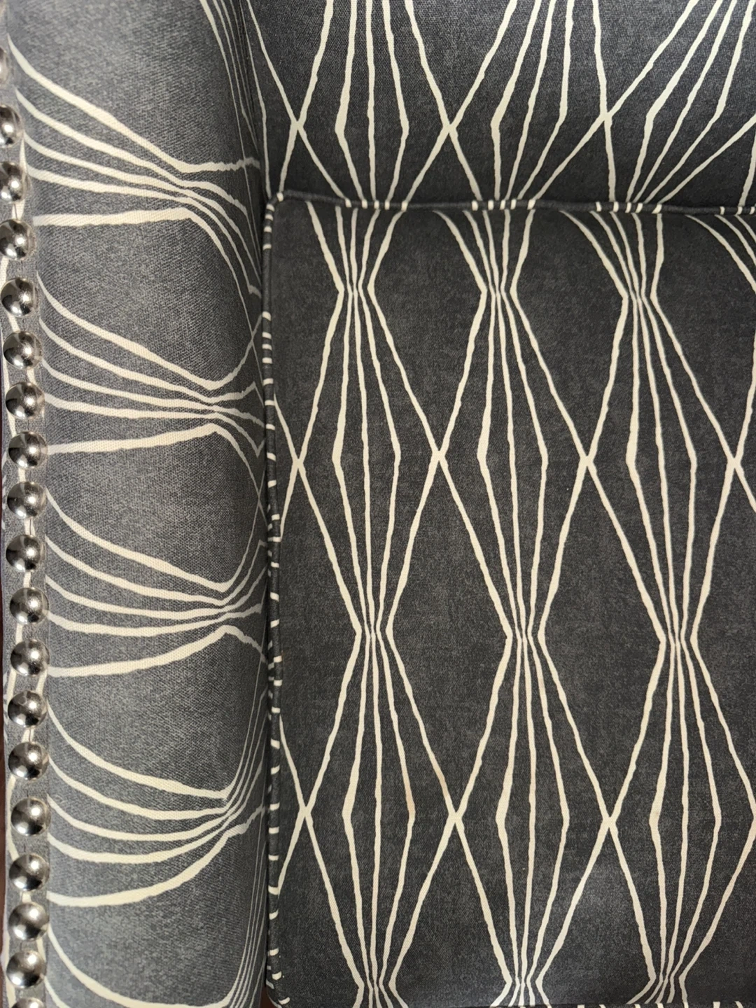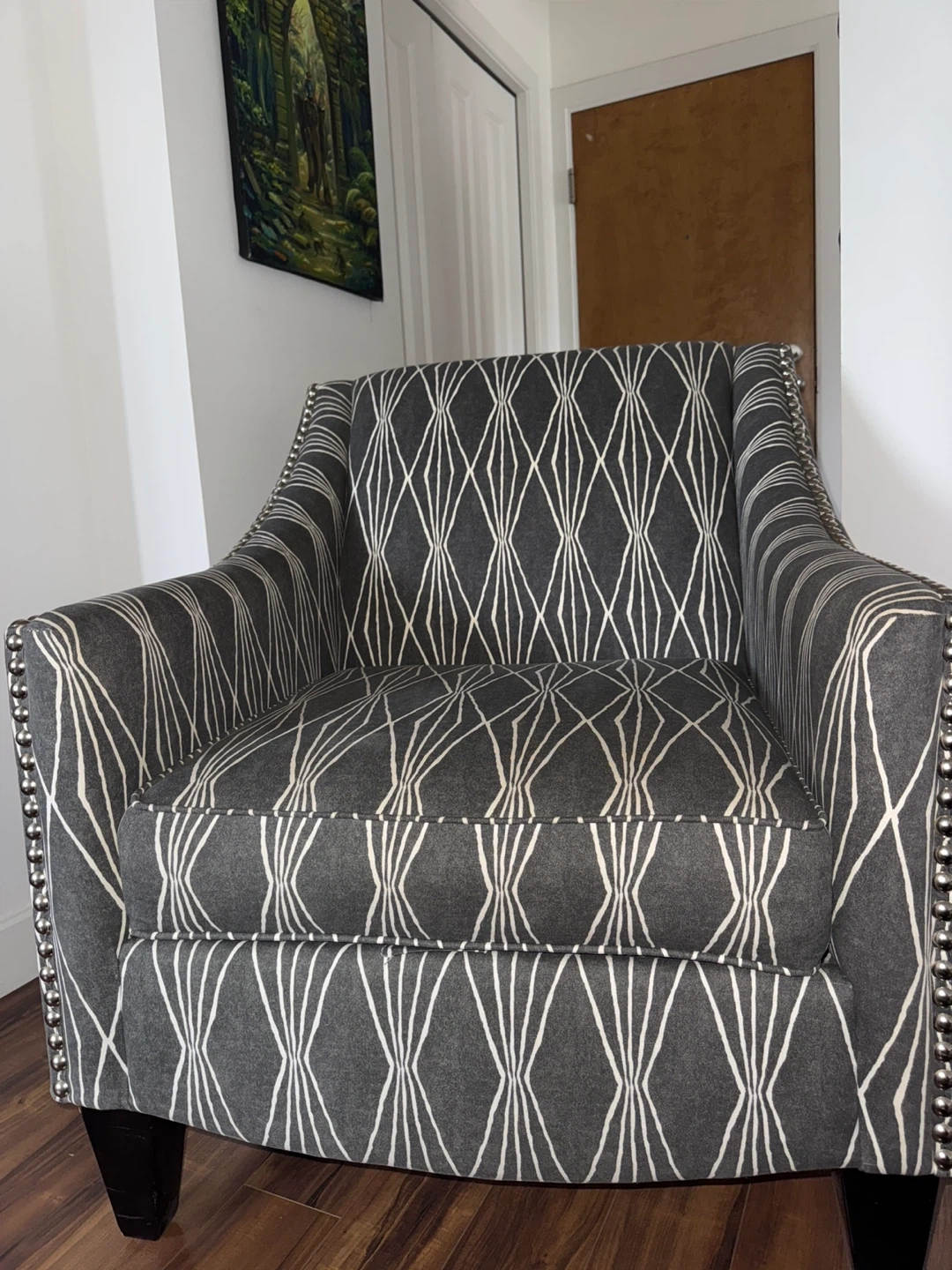 This accent chair features a stylish grey and white patterned design that would complement any living space. It's in great condition and ready for a new home. The chair has a sturdy frame and comfortable seating, perfect for relaxing with a book or enjoying a cup of tea. The nailhead trim adds a touch of elegance to the overall design