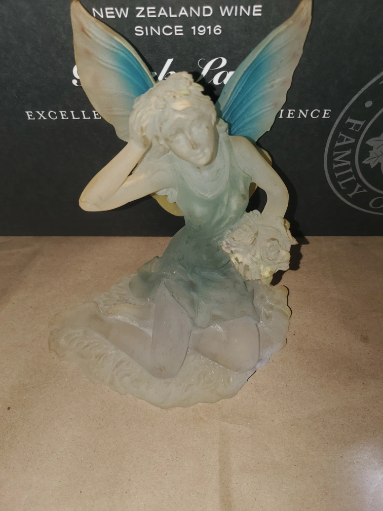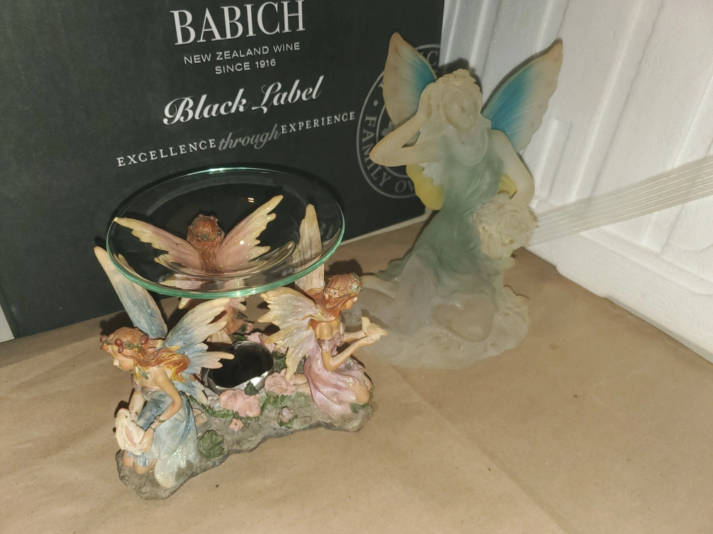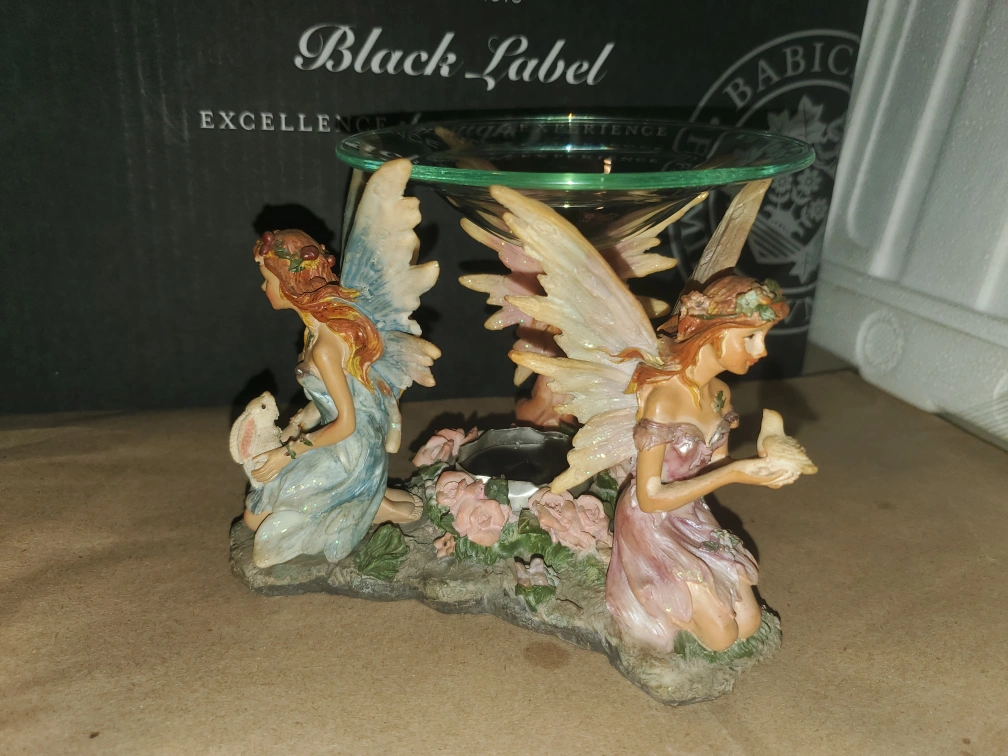 A charming fairy figurine and fairy wax/oil warmer. It's a unique decorative pieces that could add a touch of whimsy to any room