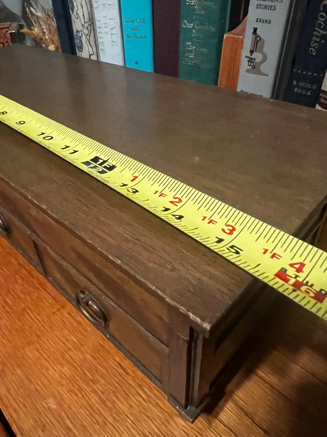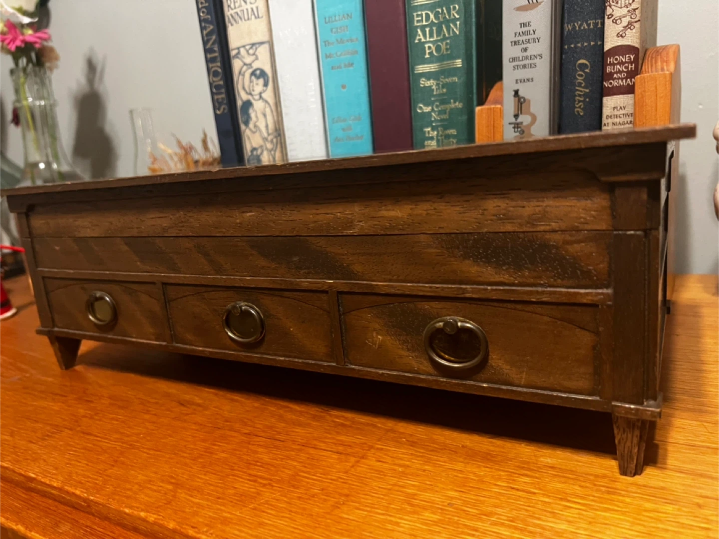 Selling a lovely vintage wooden jewelry box! It features a mirror and several compartments lined with yellow velvet. There are also small drawers with metal ring pulls. The box is approximately 14 inches long. Would be great for kitchen countertop to hold teas as well. Small piece of wood missing on left leg.