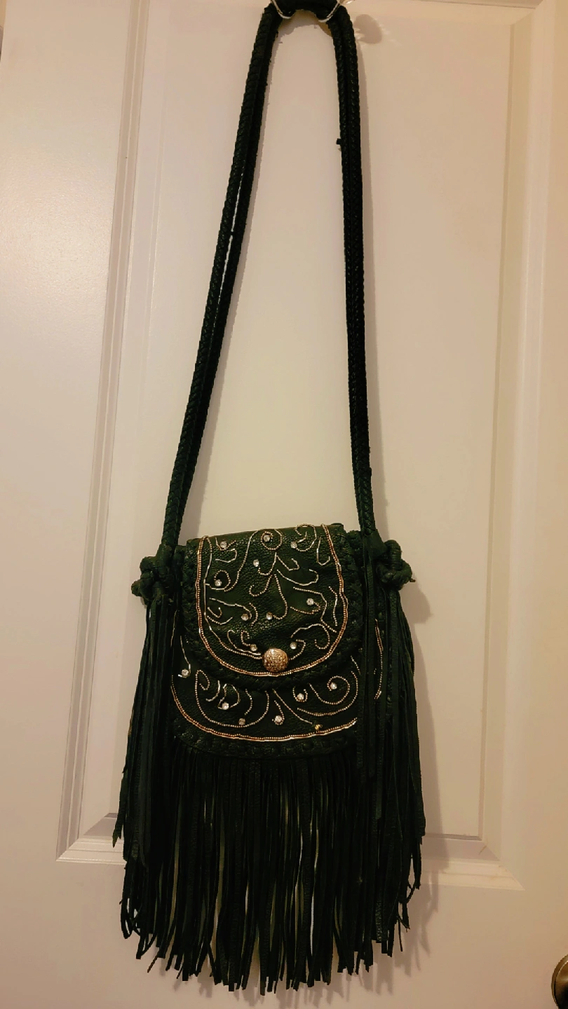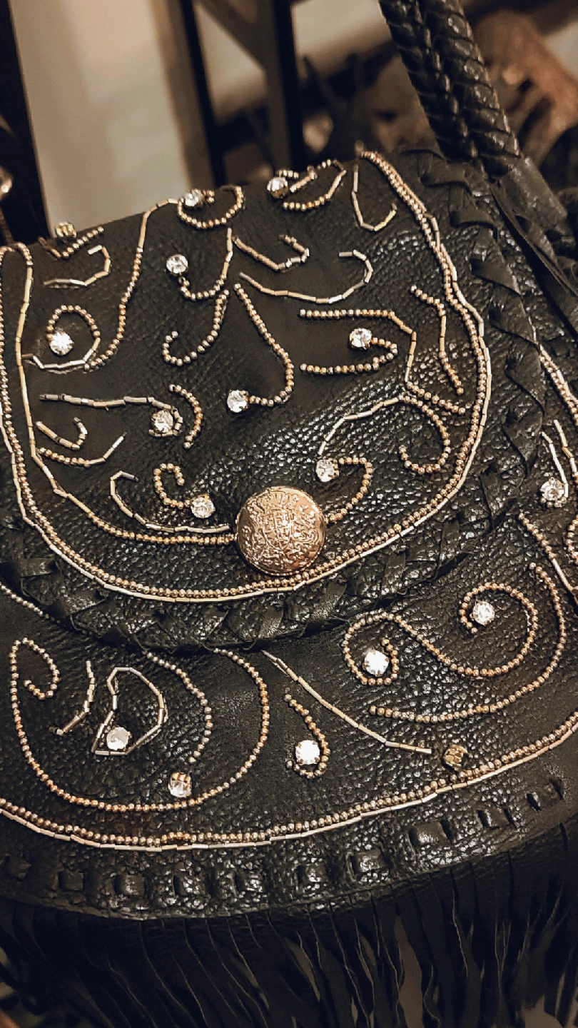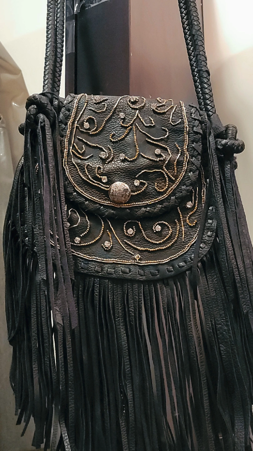 Gorgeous black shoulder bag with intricate embellishments and playful fringe detailing! It's perfect for adding a touch of bohemian flair to any outfit. The long braided shoulder strap makes it comfortable to carry around town too After further inspection it has some minor wear so its priced according to the condition