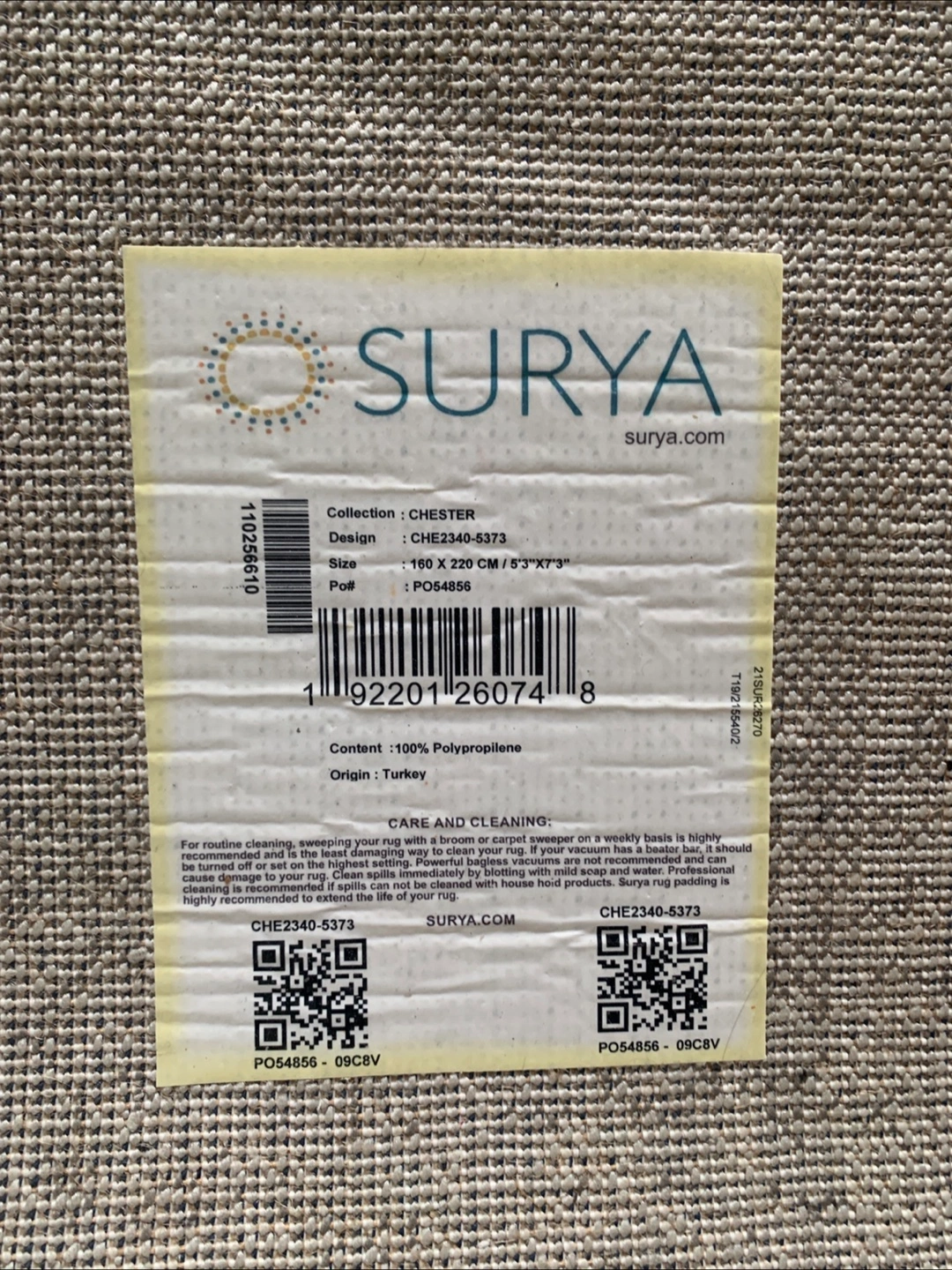 Selling a Surya Chester rug, design CHE2340-5373. It measures 160 x 220 cm, which is about 5'3" x 7'3". The rug is made of 100% Polypropylene and its origin is Turkey. It's in great condition and would look lovely in any room!