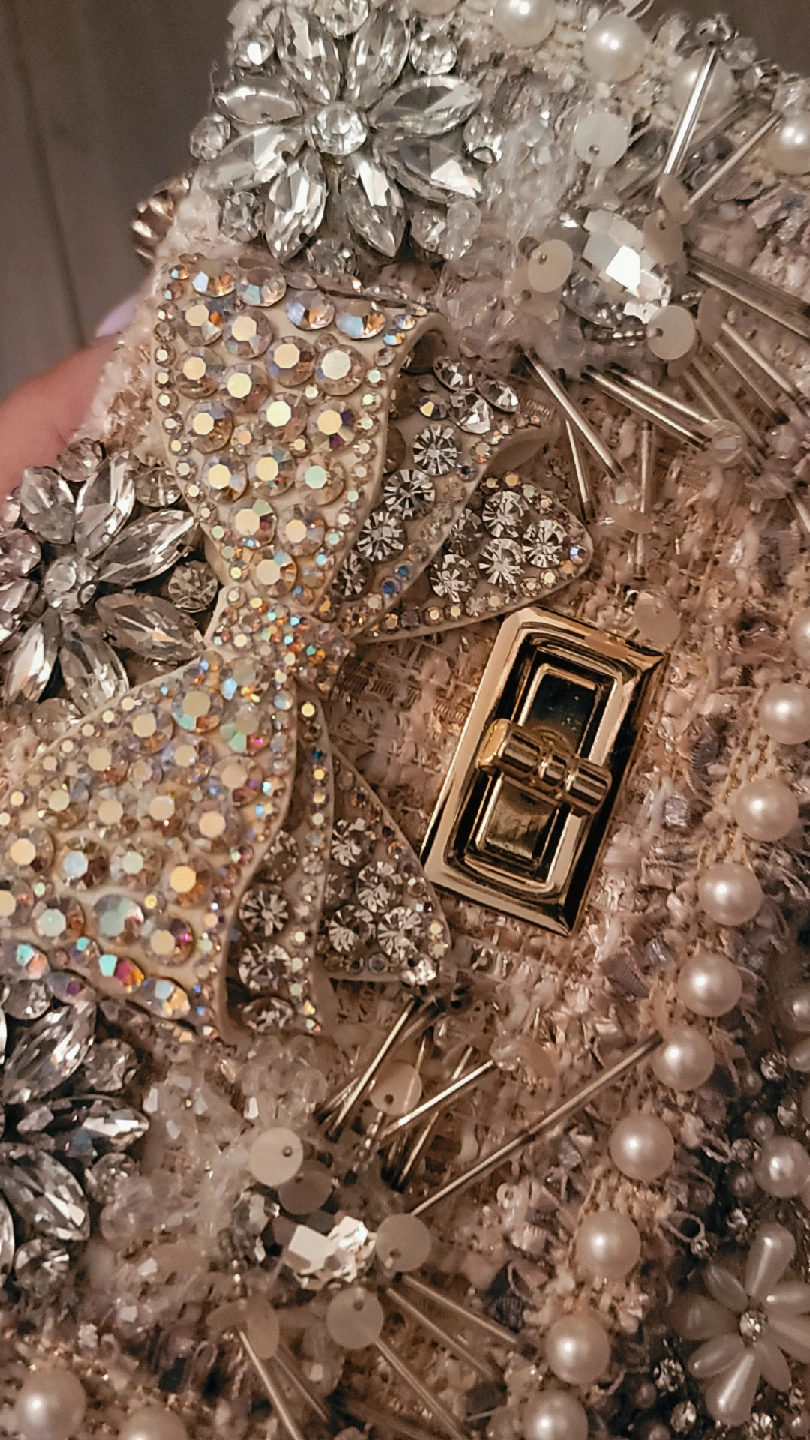 Selling a beautiful tweed embellished purse! It features intricate detailing with pearls, rhinestones, and a gold-tone clasp with a gold chain. Perfect for a special occasion or to add a touch of glamour to your outfit Brand new never used