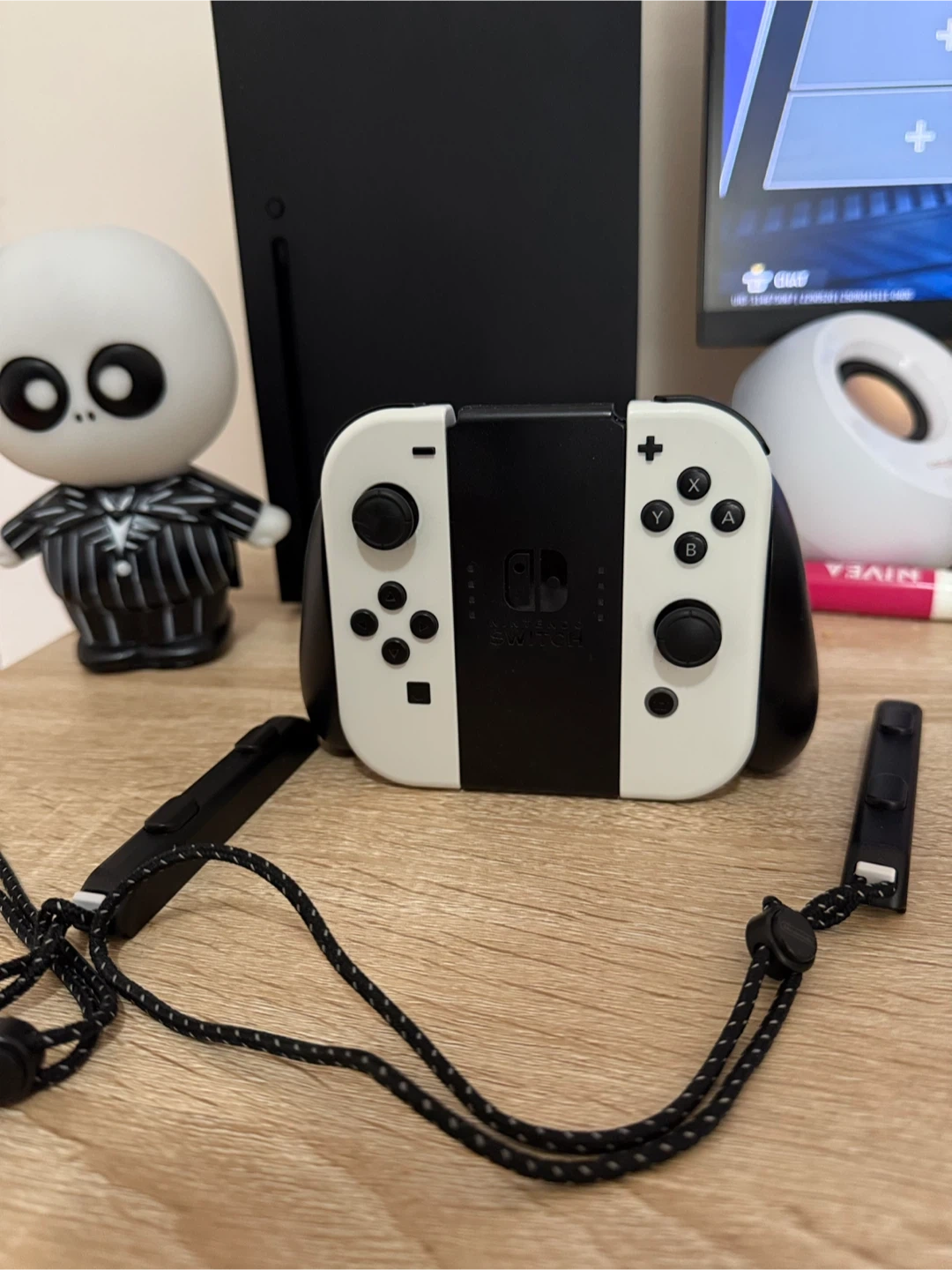Selling a pair of Nintendo Switch Joy-Cons in white and black. They are in great condition and ready for a new home. Perfect for gaming with friends or enjoying solo adventures on your Switch