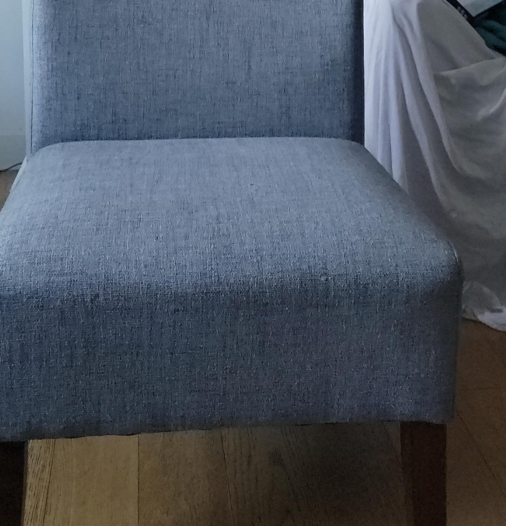 MOVE SALE~Best Offer Selling a comfortable upholstered dining chair. It's a light gray color with dark brown wooden legs. Perfect for adding a touch of style to your dining area or as an accent chair in any room