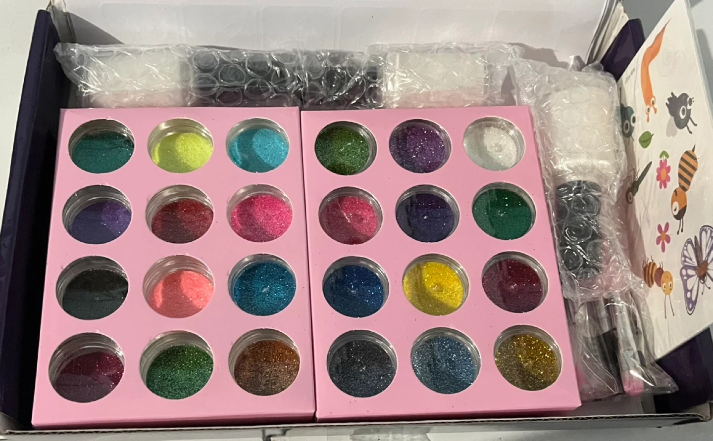 Get ready to sparkle with this fun glitter tattoos kit! It comes with a variety of colourful glitters in a pink case, stencils for creating cool designs, and brushes for application. Perfect for parties, costumes, or just adding a bit of shimmer to your day! The kit includes everything you need to create temporary glitter tattoos at home