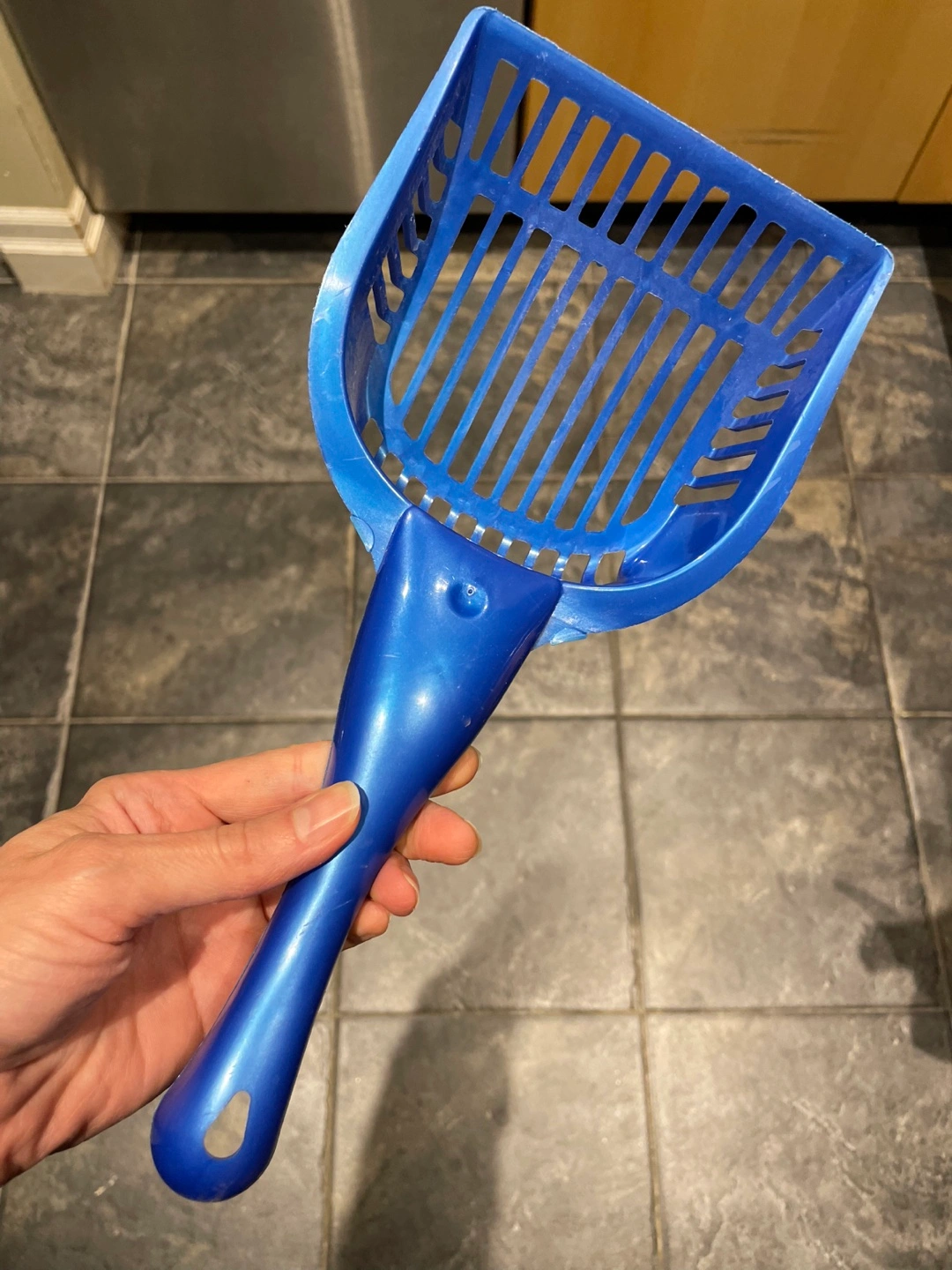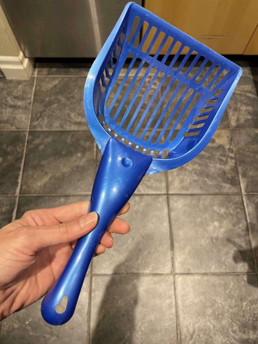 Offering a surplus blue cat litter scoop! It's in good condition and ready to help keep your kitty's litter box clean and tidy of course.