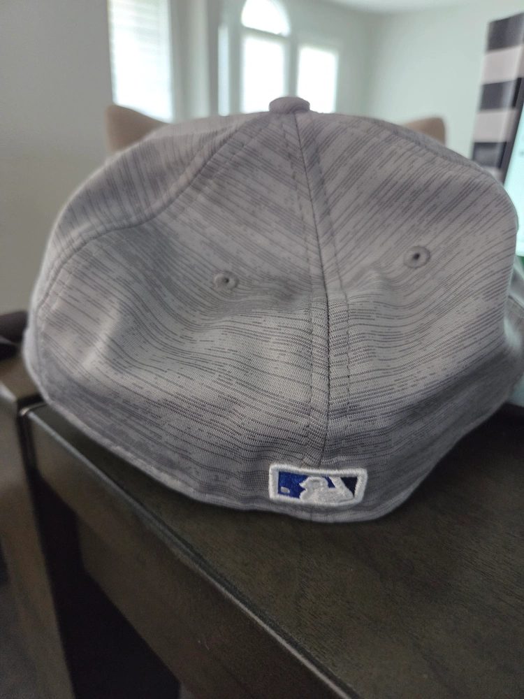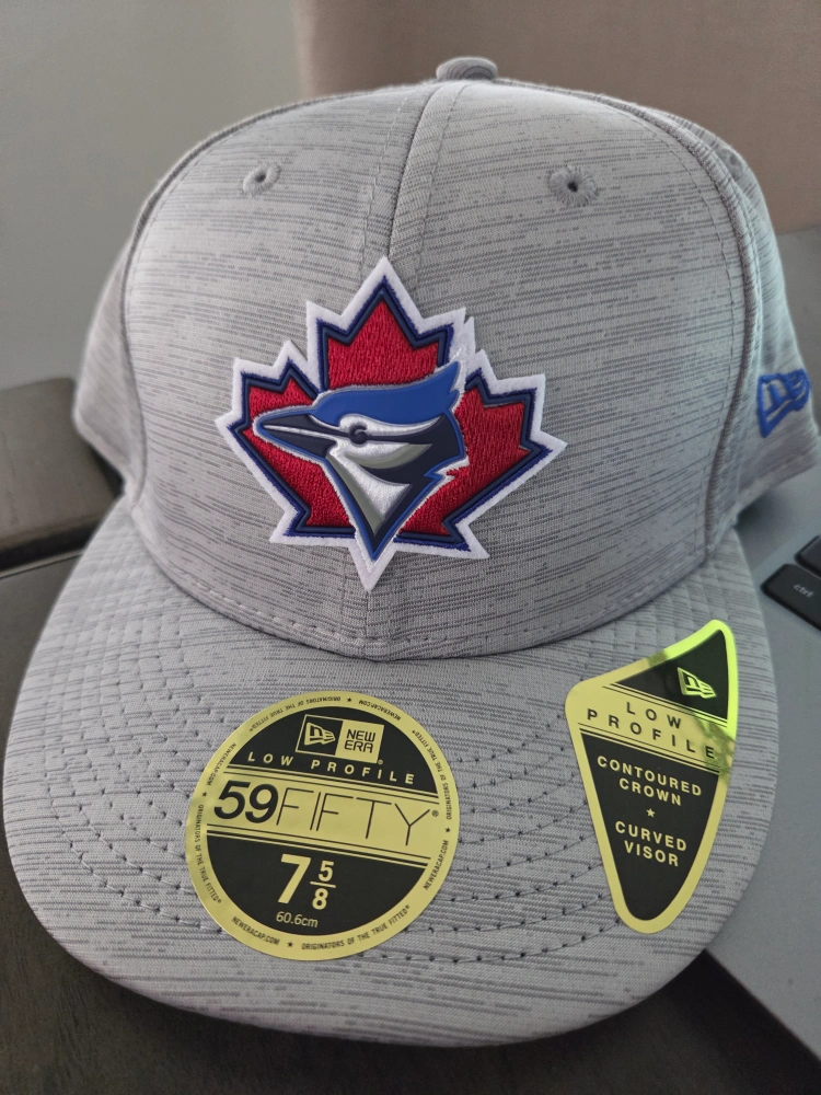 Selling a New Era Toronto Blue Jays 59FIFTY Low Profile hat in size 7 5/8. It features a contoured crown and a curved visor. The hat is made of 95% polyester and 5% spandex.