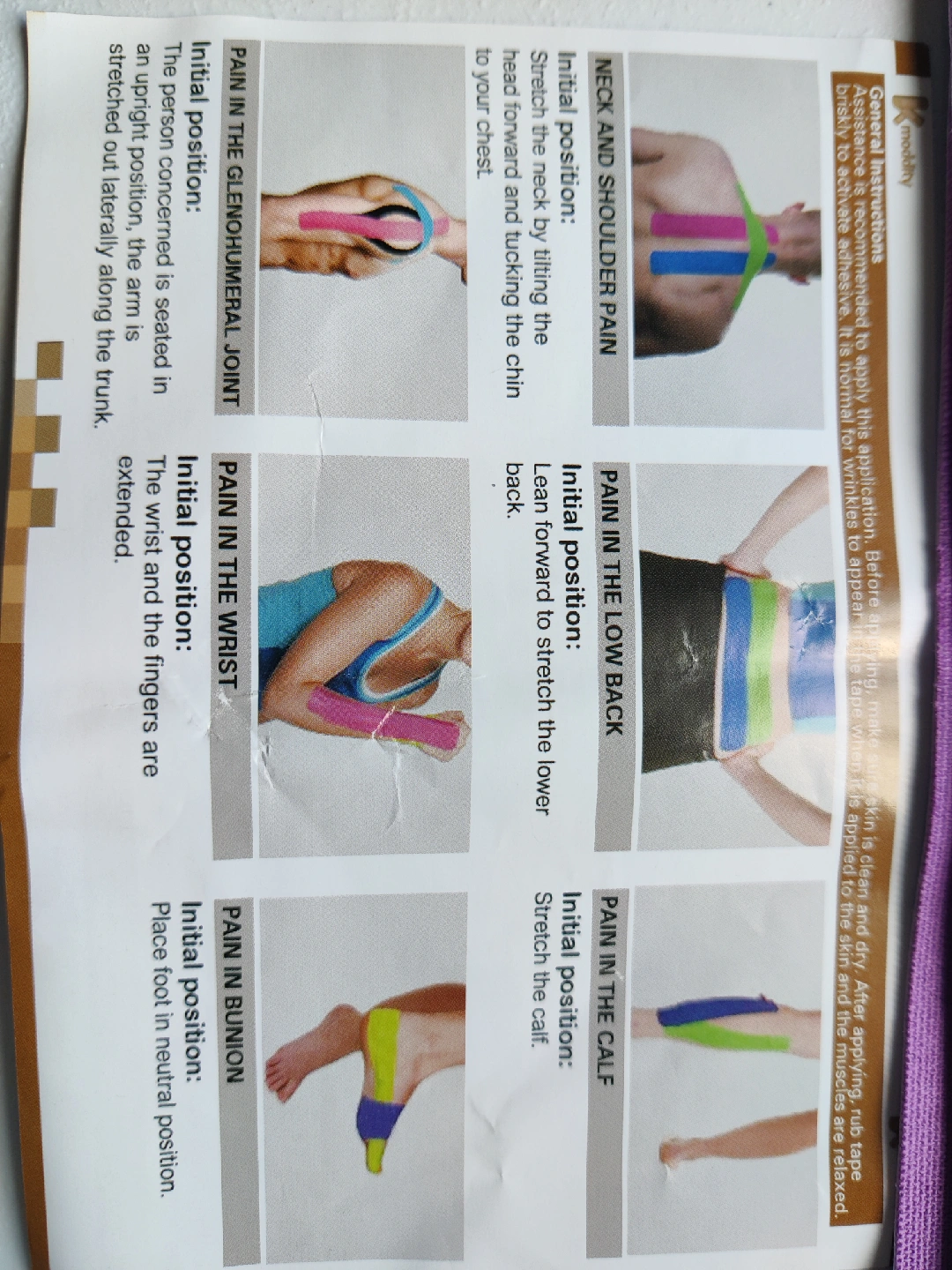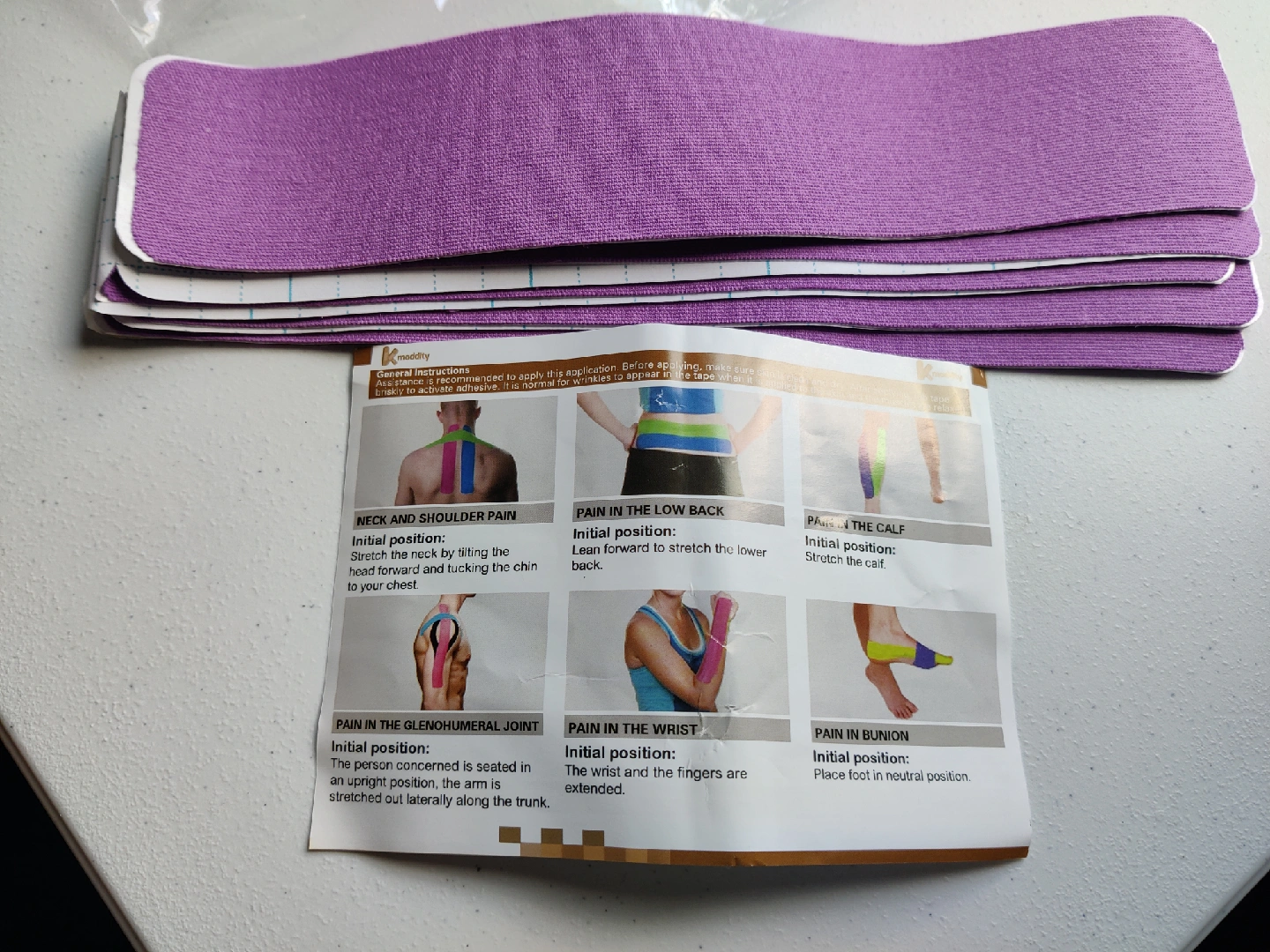 10 strips of Kinesiology tape for pain relief and muscle support. Includes instructions for application on various body parts like neck, shoulder, lower back, wrist, calf, and bunion. Great for general shoulder pain, tennis elbow, knee joint pain, and more! Perfect for athletes or anyone needing extra support