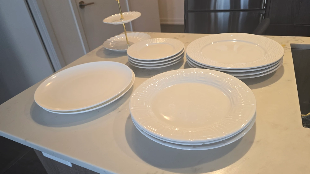 Selling a set of white dinner plates and a cute two-tiered serving stand. Perfect for everyday use or special occasions. They're in great condition and ready for a new home! Need them gone as I'm moving