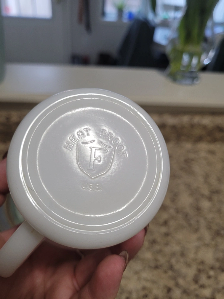 Selling a set of two Fire King milk glass mugs. They are in great condition and ready for a new home! The mugs are marked with the Fire King logo and "Heat Proof" on the bottom.