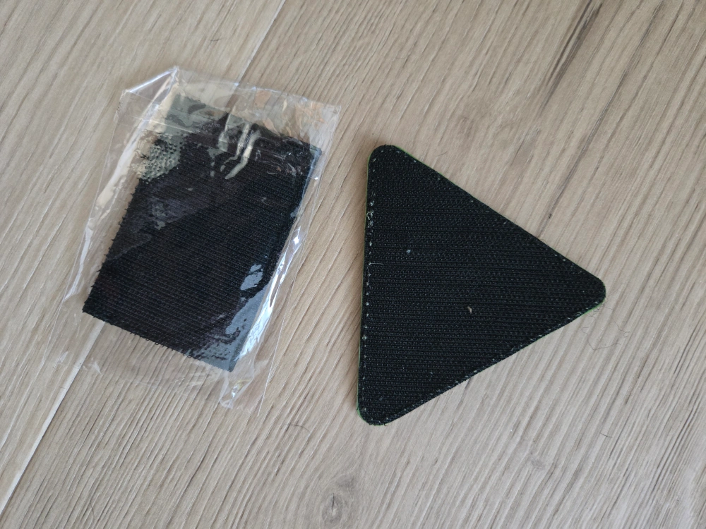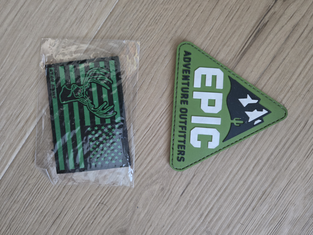 Two cool patches for your outdoor gear! One is a triangle-shaped 'EPIC Adventure Outfitters' patch, and the other is a rectangular patch with a moose design against a striped background. Both have a hook-and-loop backing for easy attachment