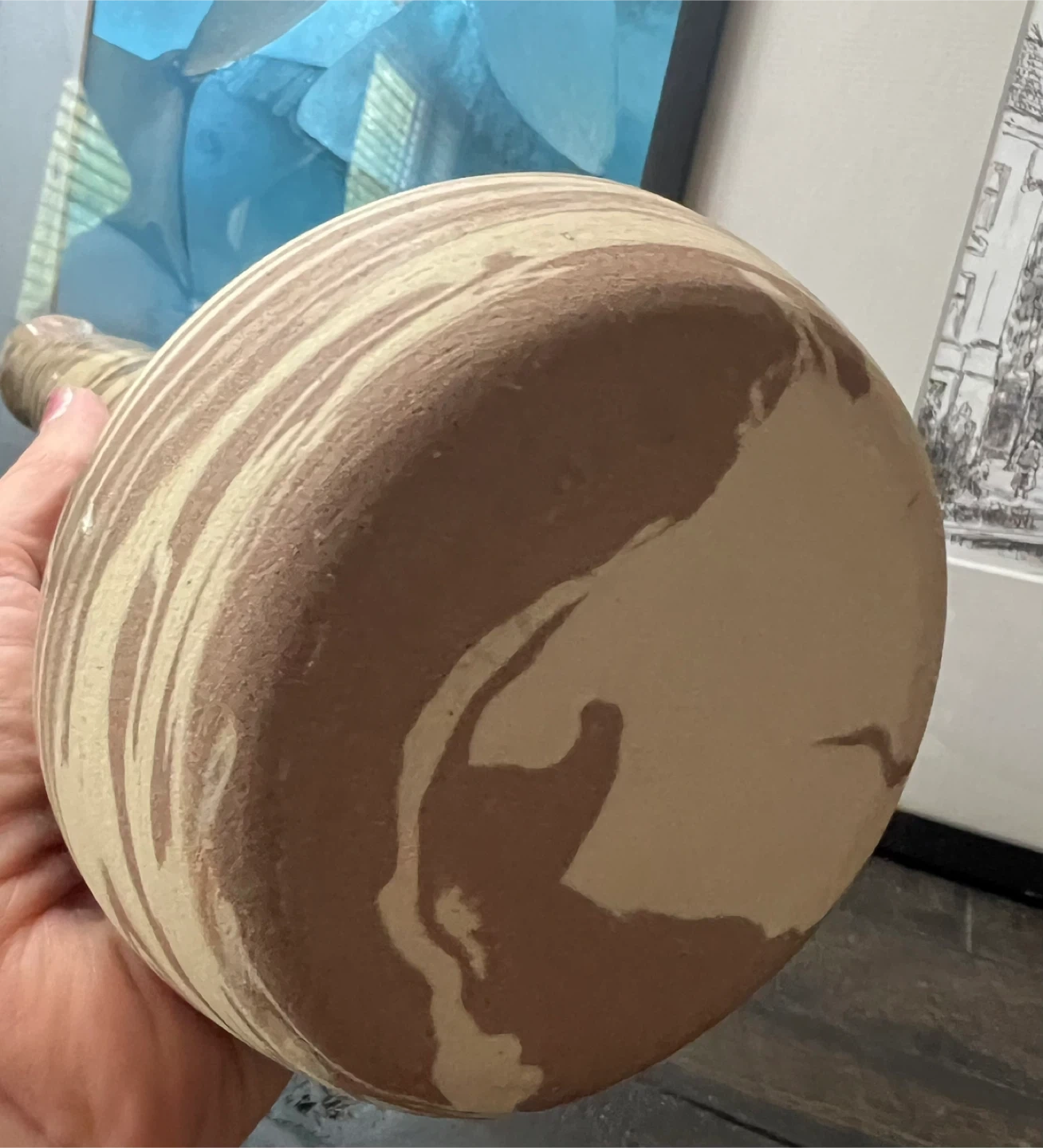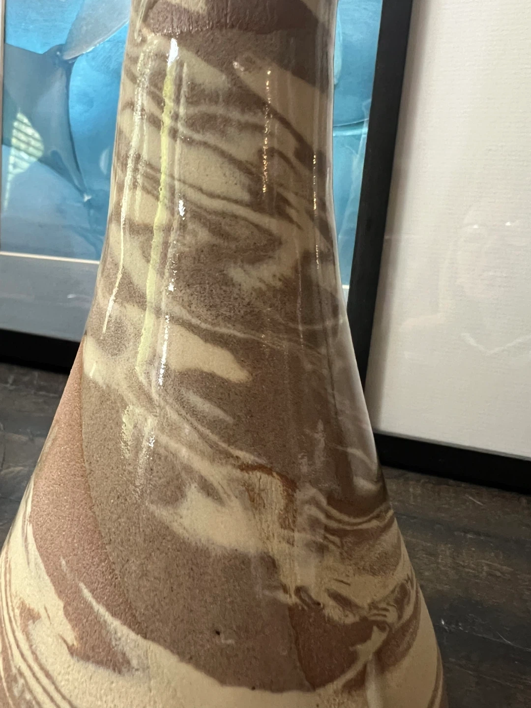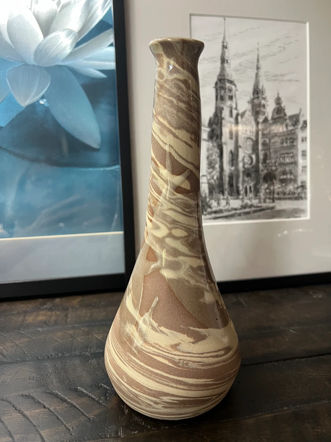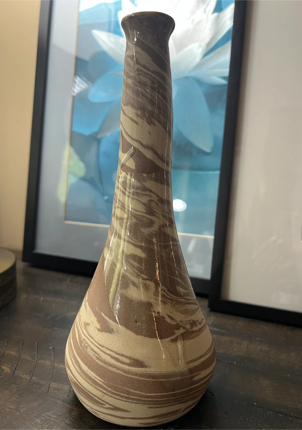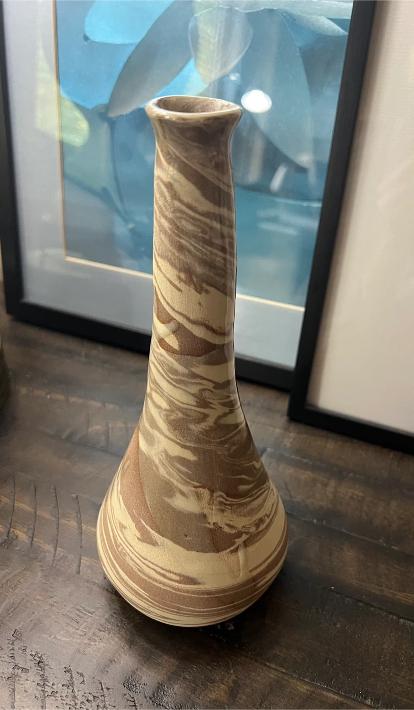 Unique bud vase with swirled pattern of brown and beige tones