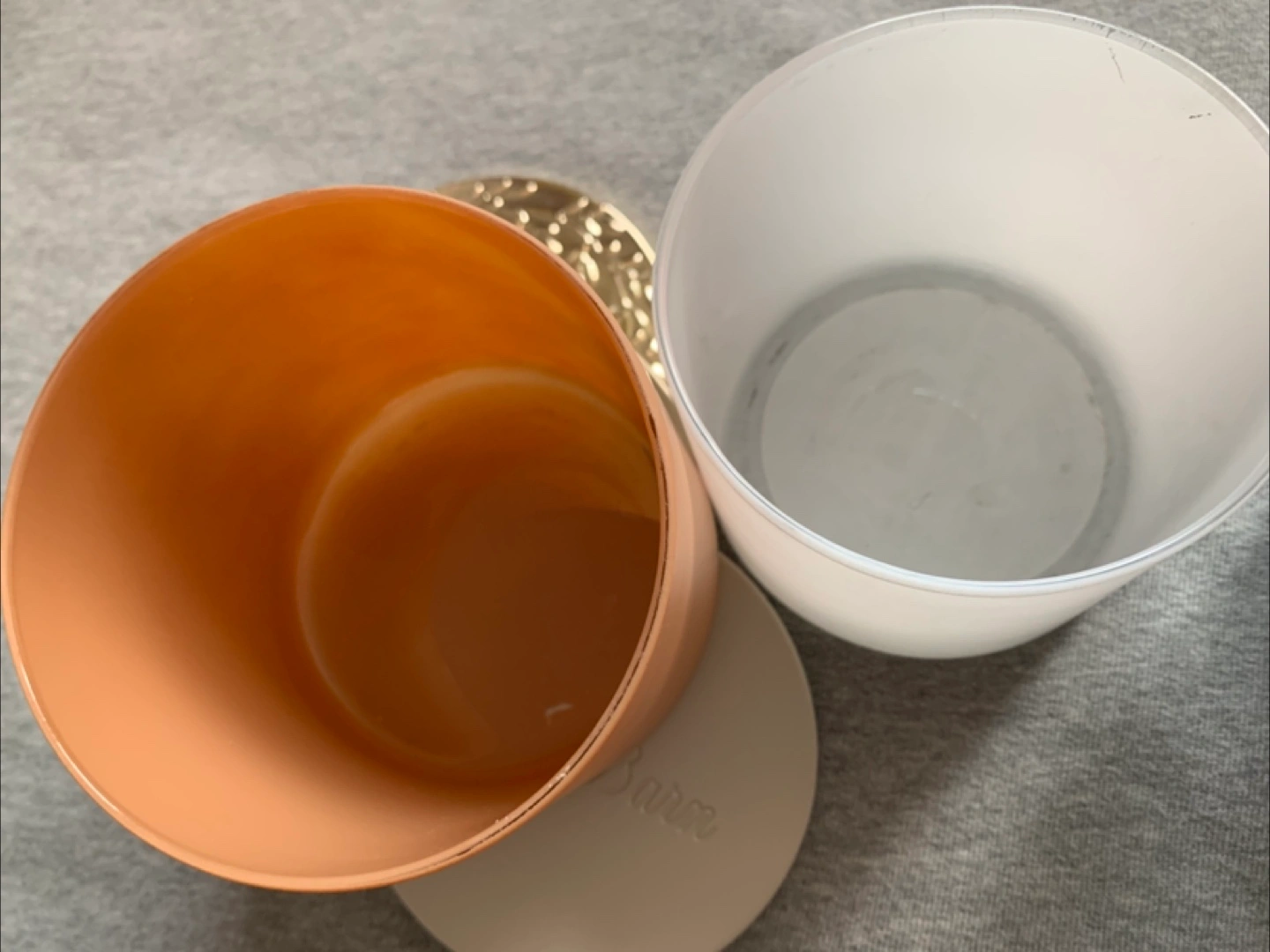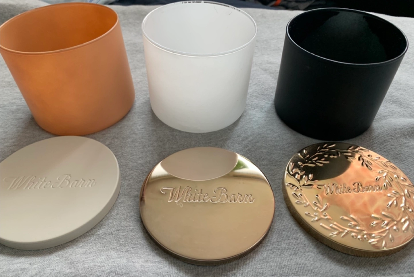 Cleaned out empty White Barn 3 wick candle holders. There's one in muted peach/orange, one in white, and one in matte black. I’ve used them as storage of small bathroom toiletries etc mostly.