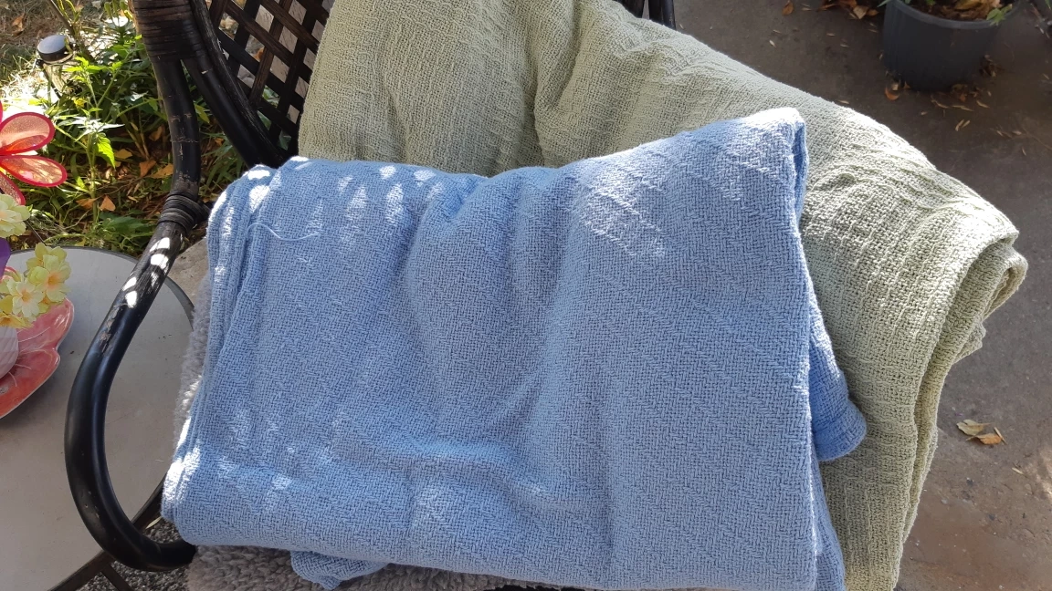 Selling two gently used blankets! One is a soft blue and the other a light green. Both have a nice textured weave. They're perfect for adding a cozy touch to your home. lightweight for summer. selling together
