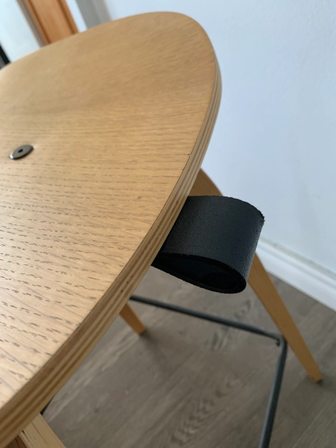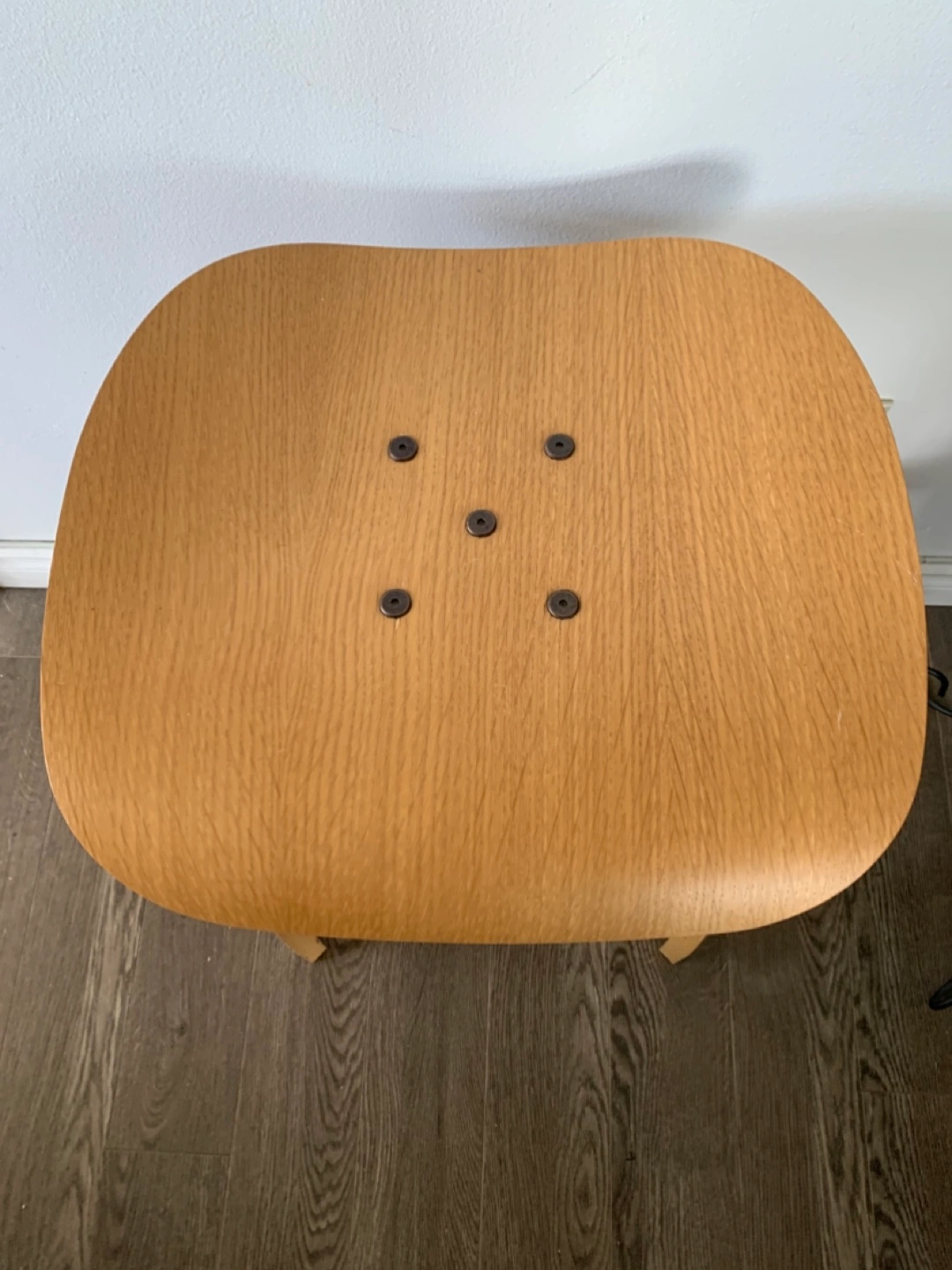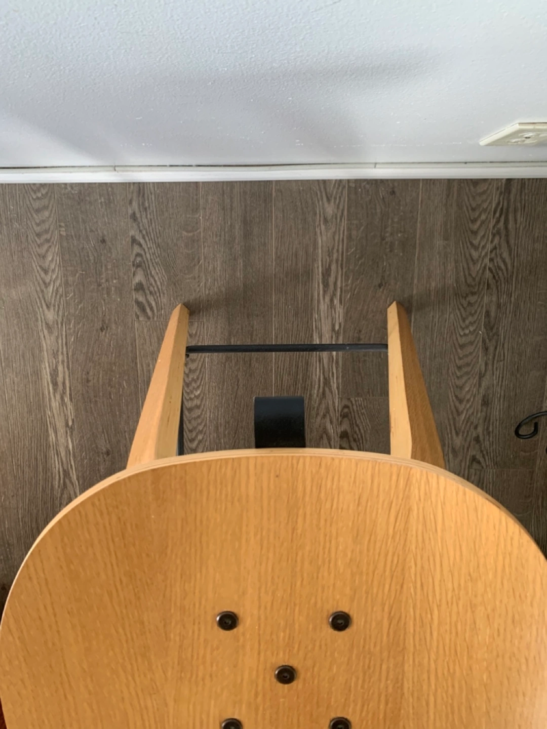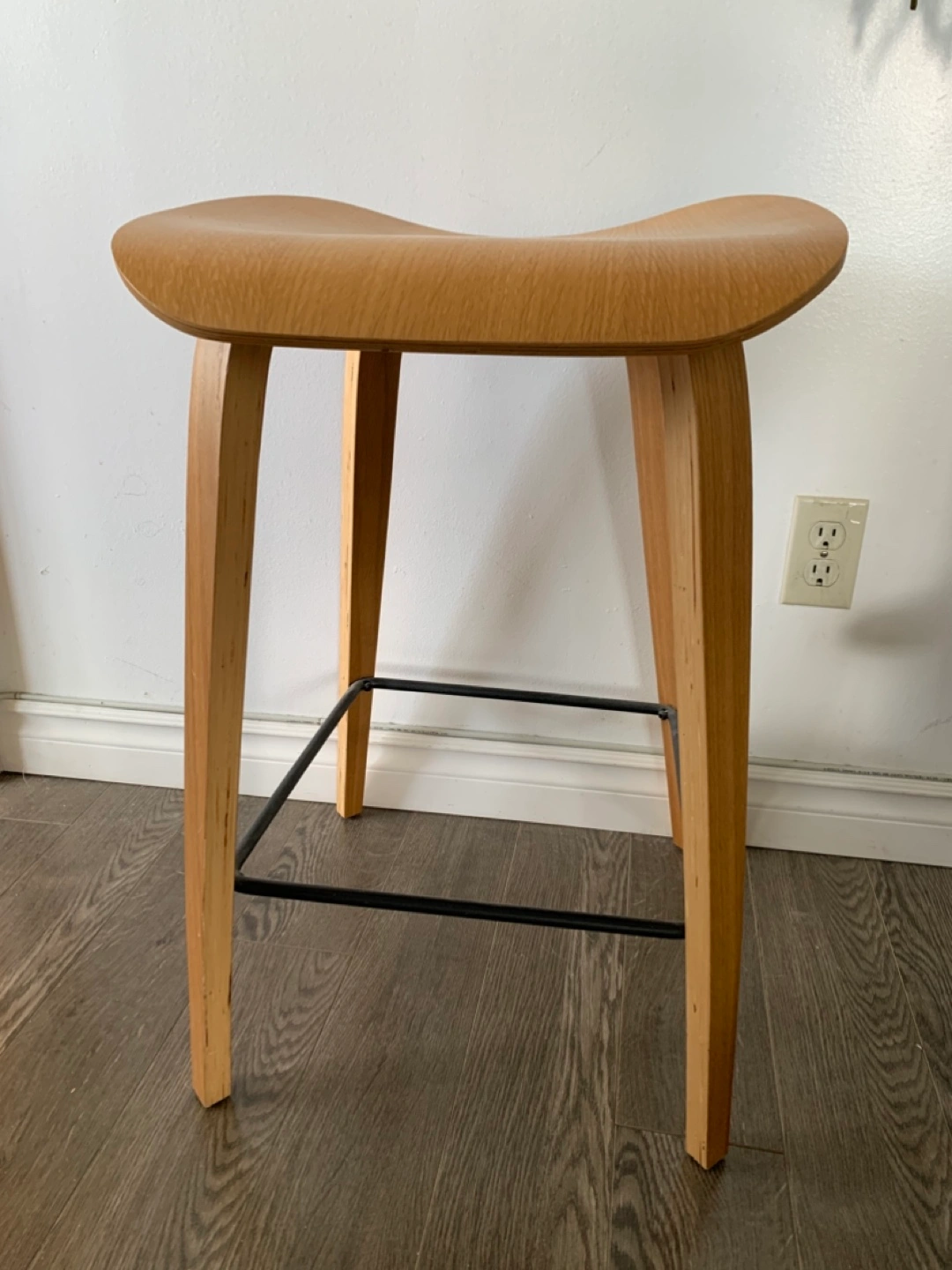 Light honey blond wood colour with a black metal foot rest support. Great for a kitchen island or bar area! Has a cute little leather strap handle at the back that swivels in and can be hidden under the seat. I believe it’s from Urban Barn. Really well made. Very solid.