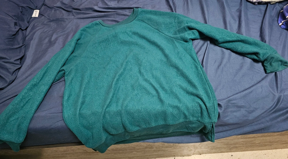 Selling a comfy green terry cloth crewneck sweater! It's in great condition and perfect for cozy days. The material is soft and the colour is a nice, deep green. It would be a great addition to your wardrobe for a casual and comfortable look