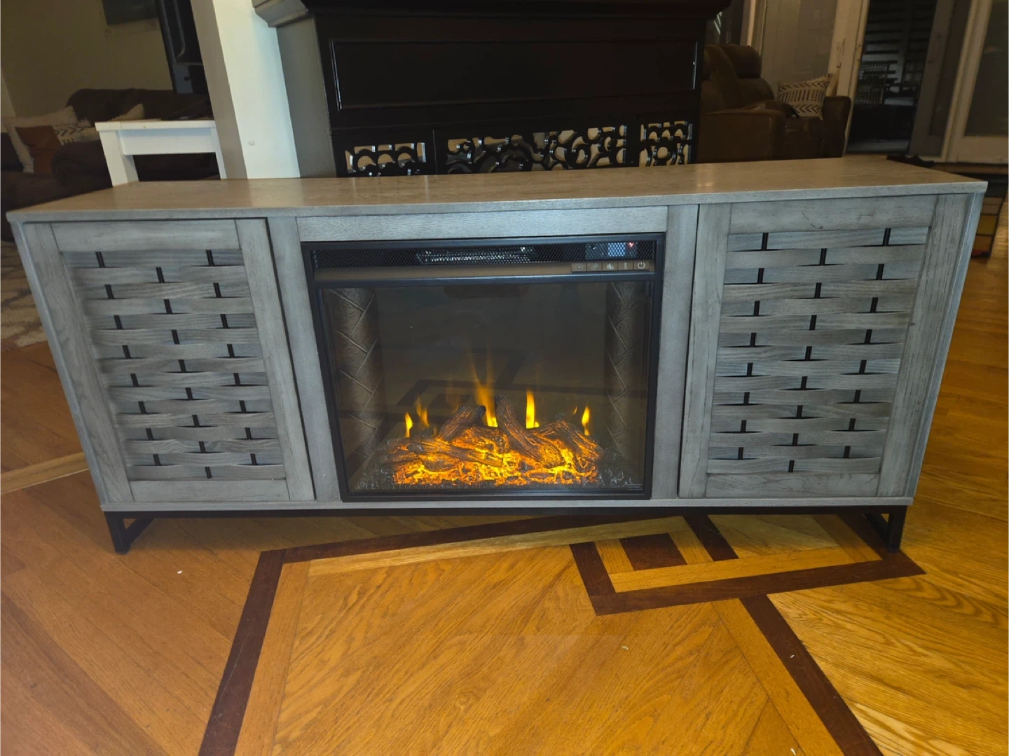 This electric fireplace TV stand features woven door details and measures 58 inches wide, 26 3/4 inches tall, and 15 3/4 inches deep. It's a stylish and functional addition to any living room! Brand new.