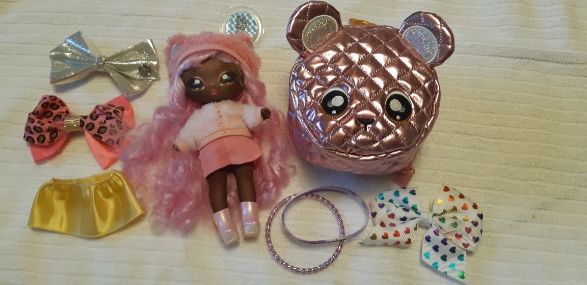 Selling a Na Na Na Surprise doll from the Glam Series! She comes with a cute pink outfit and accessories, including purse, bows, a skirt, and bracelets. Perfect for collectors or kids who love imaginative play!