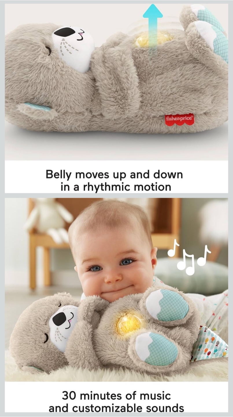 This Fisher-Price Soothe 'n Snuggle Otter is ready to help your little one drift off to dreamland! It's super soft and cuddly, with gentle music and sounds to create a calming environment. The otter also has a light-up belly that mimics the rhythm of breathing. Recommended for newborns and up! • Plush baby soother, safe from birth • Belly moves with a calming “breathing” motion • Plays up to 30 min of music, sounds & soft lights • Super soft fabrics + satiny tail for extra comfort • Helps soothe, relax, and comfort little ones • Adorable cuddle buddy your baby will love • Excellent for nap or bedtime!