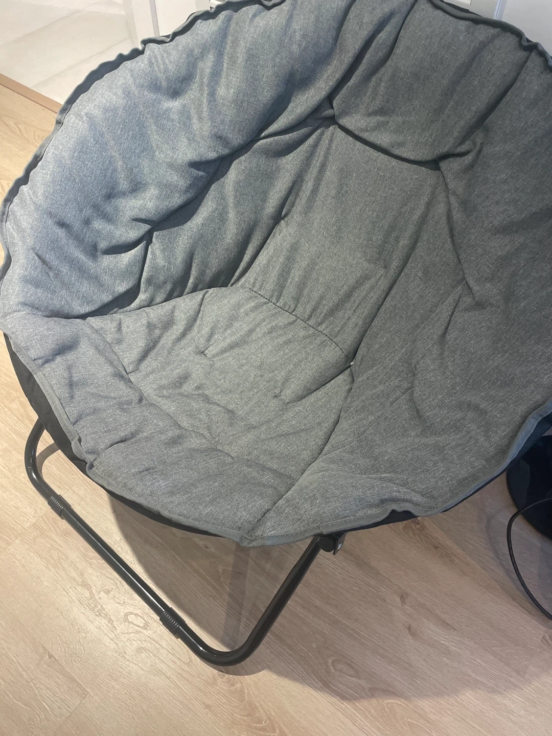 Selling a comfy moon chair! It's in okay shape and perfect for adding a cozy touch to any room. The grey colour is neutral and goes with everything. The legs of the chair are a bit bent from a heavy load.