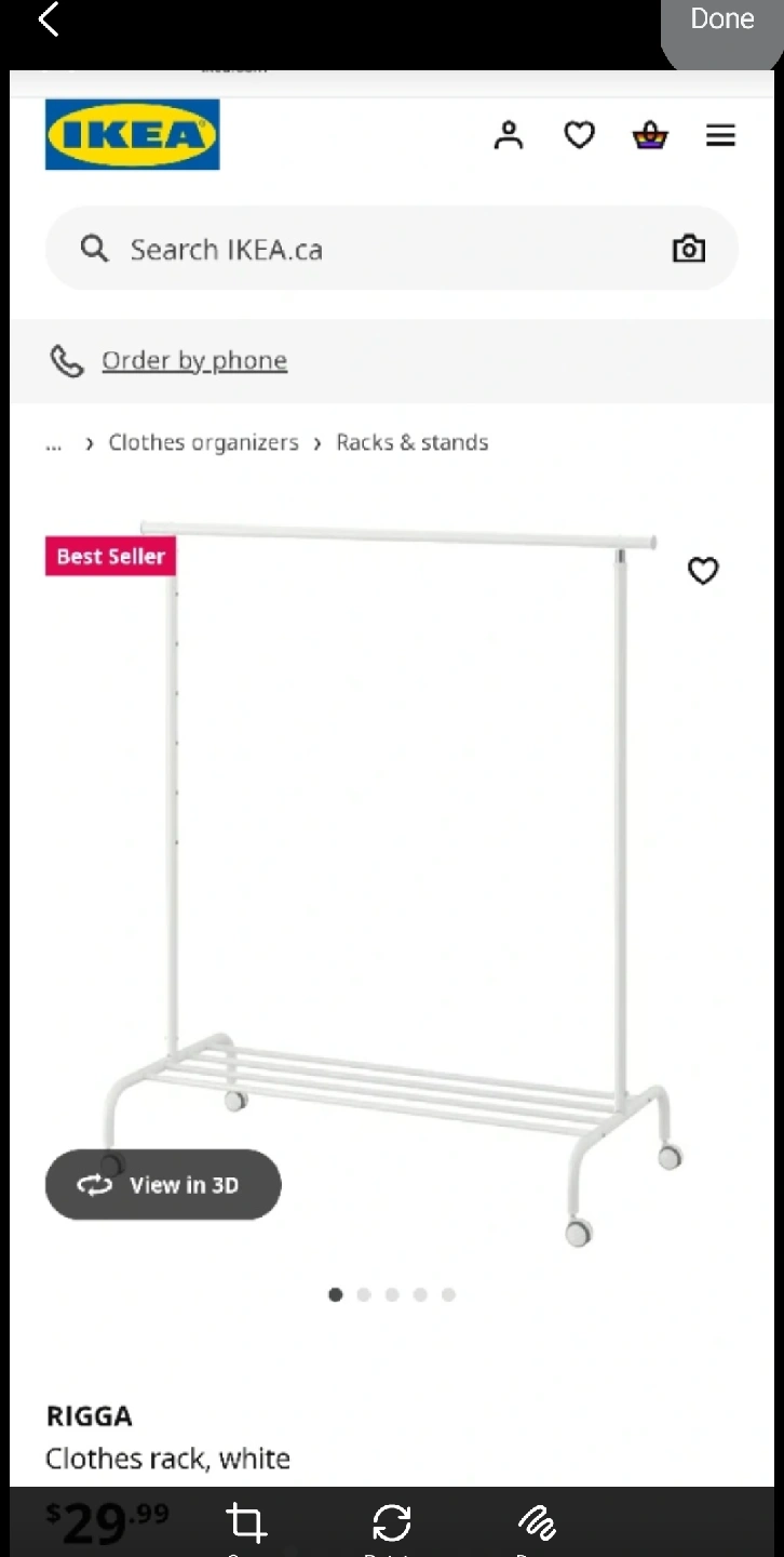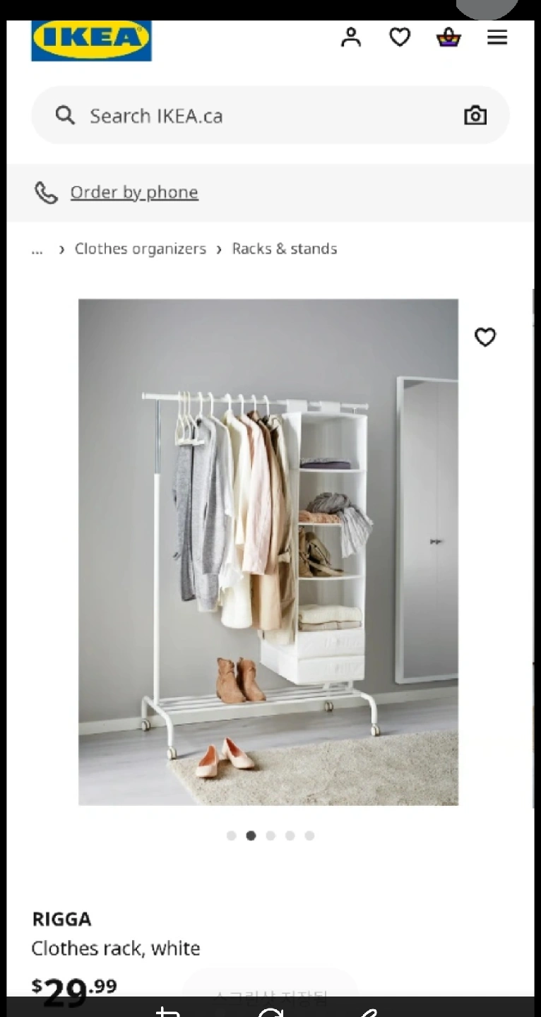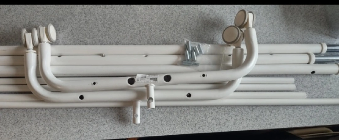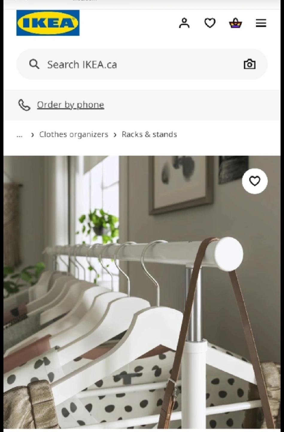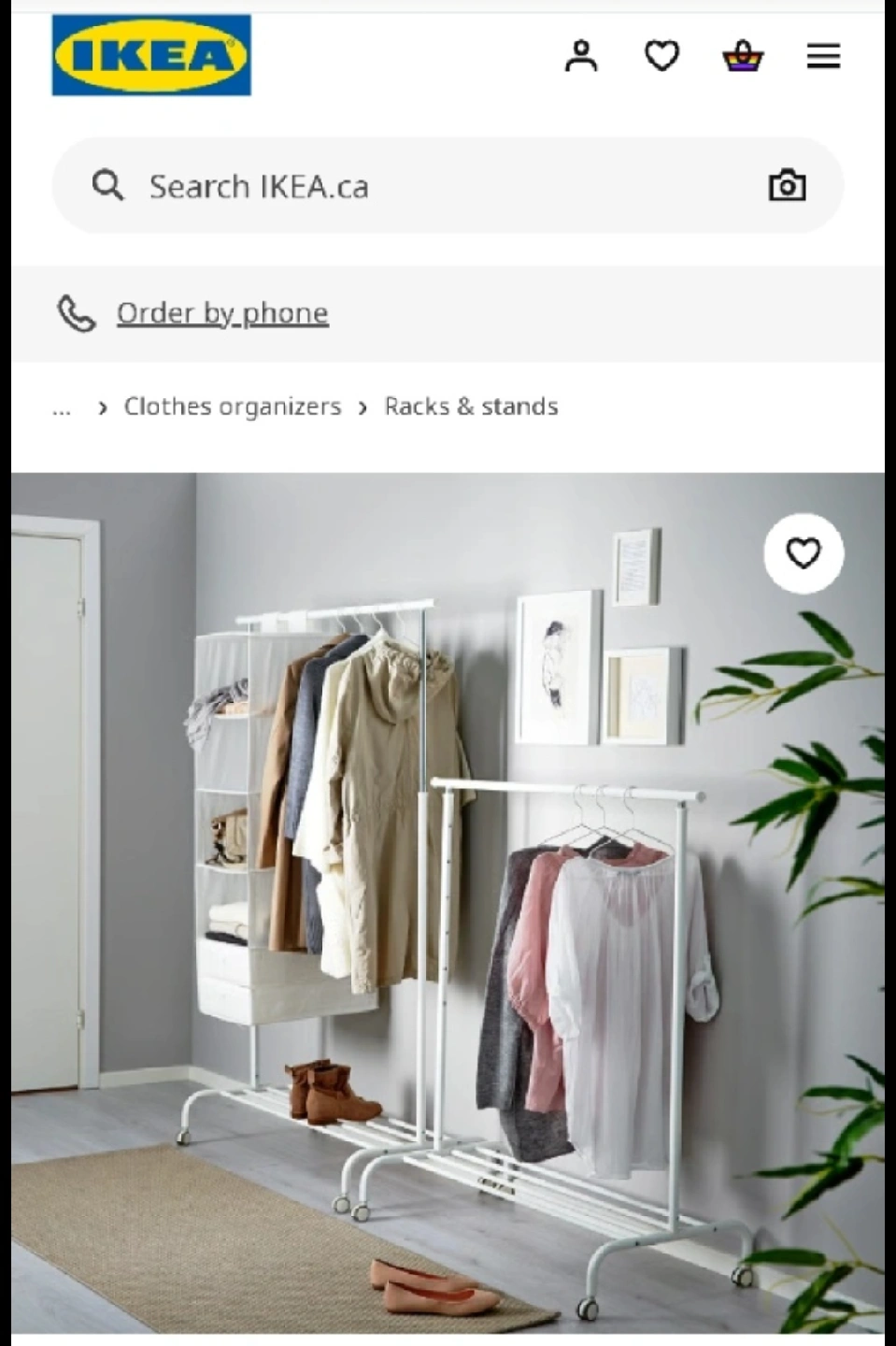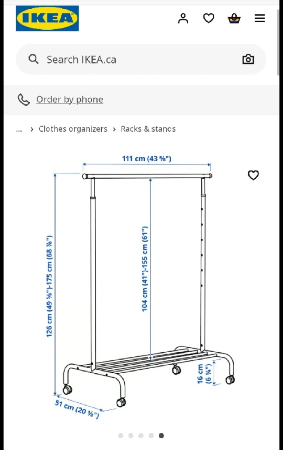 Selling an IKEA RIGGA clothes rack in white. It's a great solution for organizing your clothes! - Dimensions: 111 cm (43 3/4") wide, adjustable height from 126 cm (49 5/8") to 175 cm (68 7/8") - Includes a bottom shelf for shoes or boxes - Easy to move around with its four castors