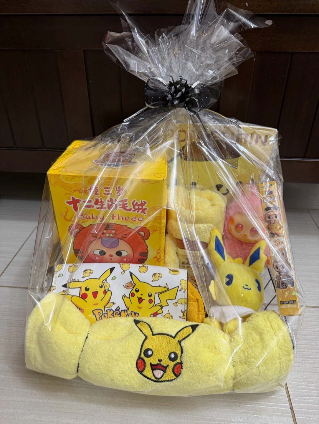 A cute Pokémon themed gift set, perfect for a baby! It includes a variety of items, all in a cheerful yellow colour. The box says 'Baby Three' and '十二生肖毛绒'. Great for a little one who loves Pokémon!