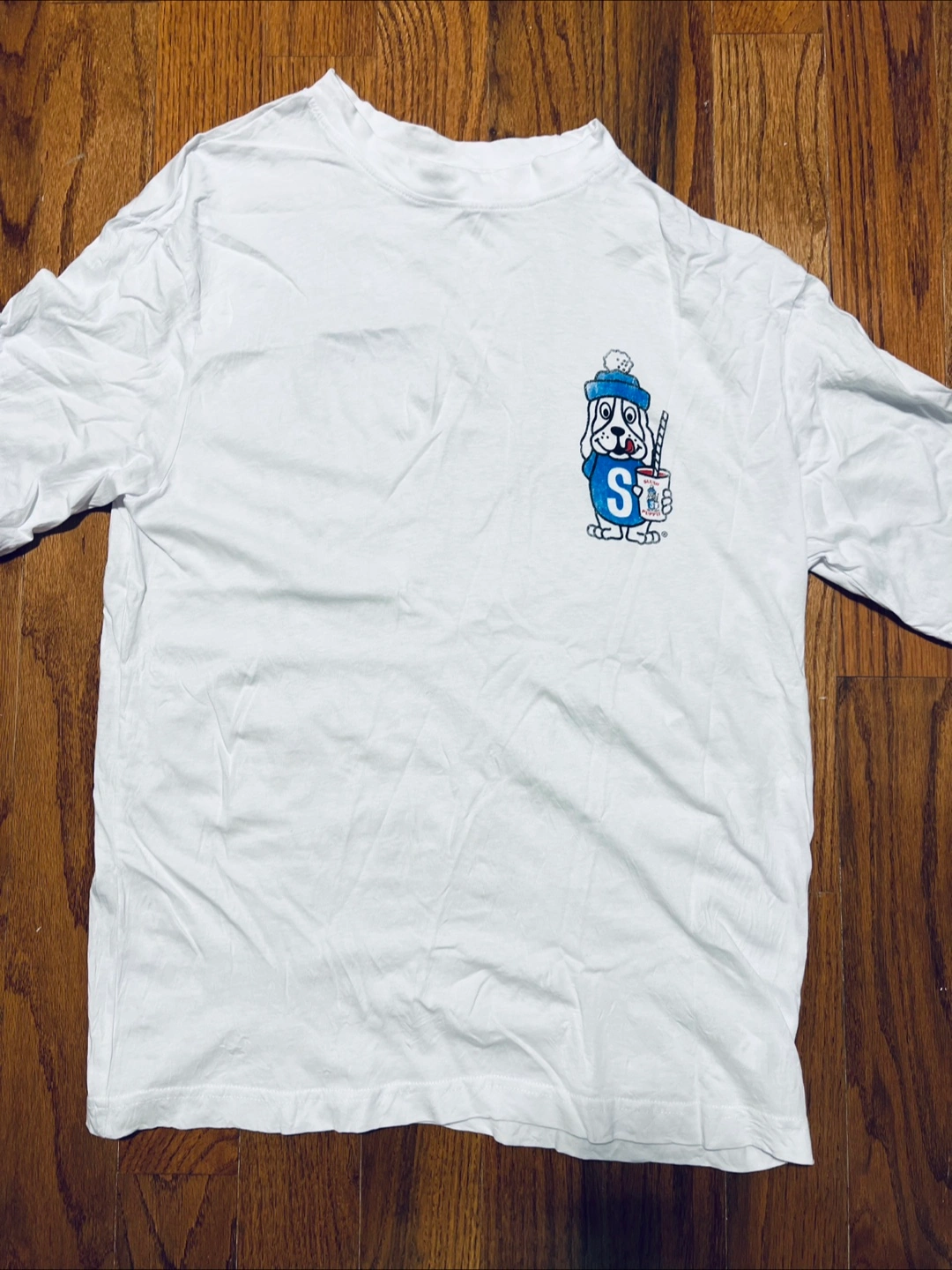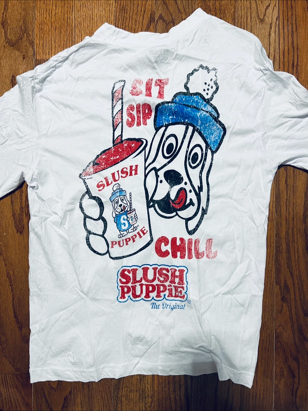 128Selling a white Slush Puppie graphic t-shirt! The shirt features a fun design with the Slush Puppie logo and a cute dog character. It's perfect for fans of the classic frozen treat or anyone who loves a unique graphic tee