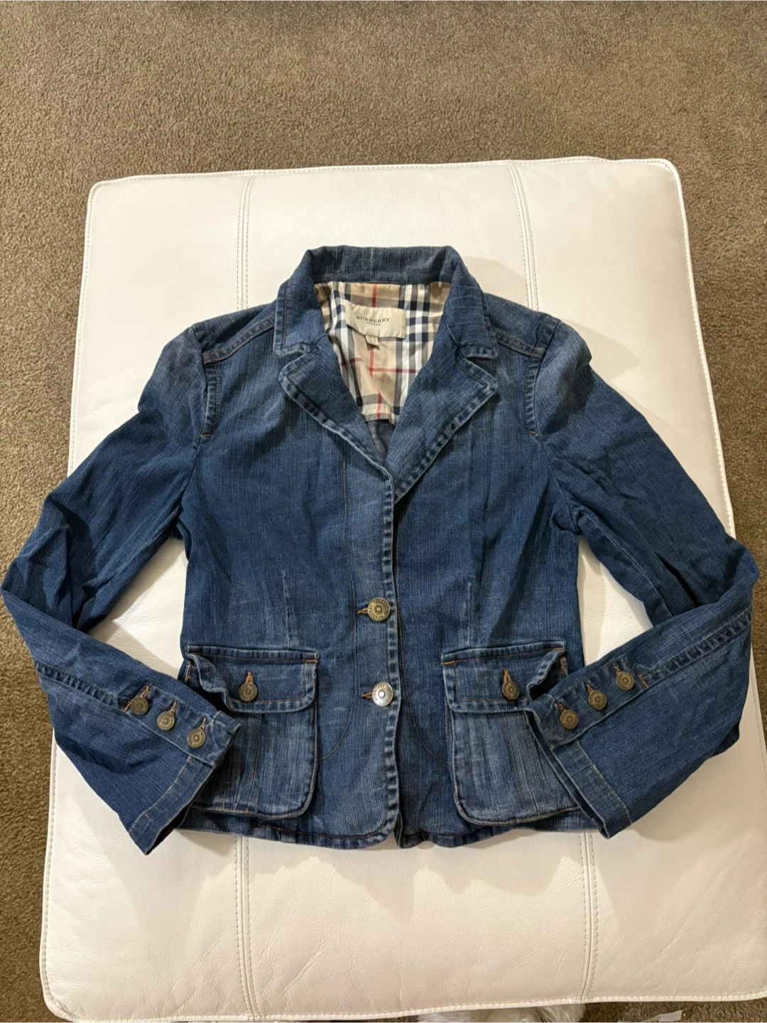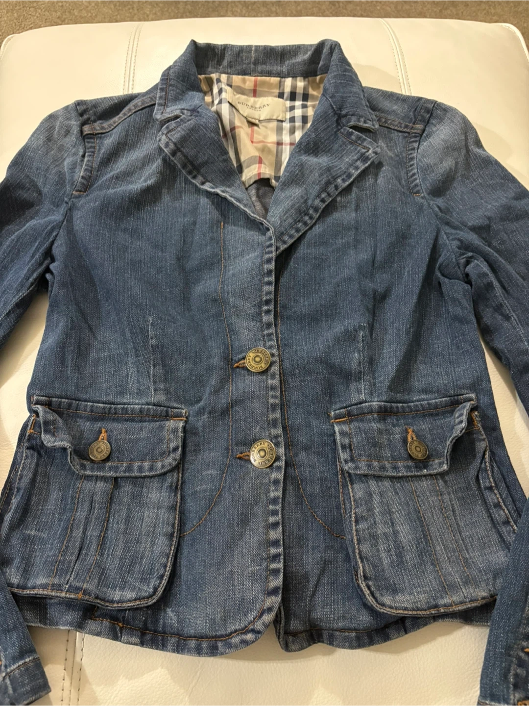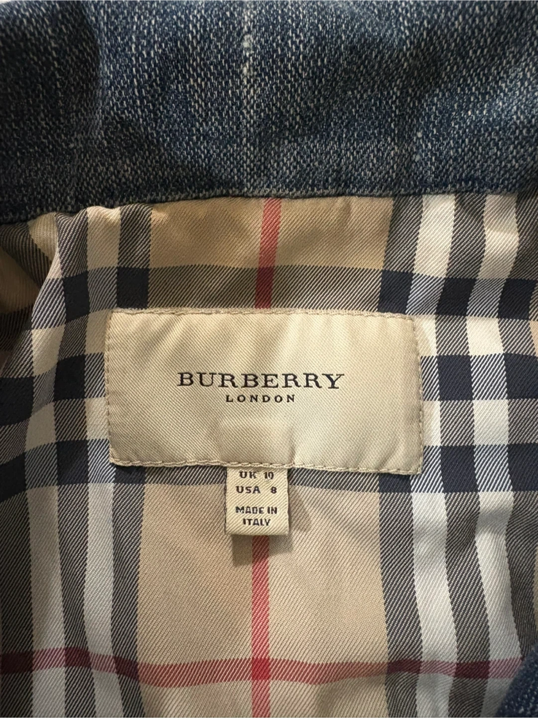 Selling a stylish Burberry London denim jacket. It's a size 8 and features the classic Burberry plaid lining. A fashionable addition to any wardrobe!