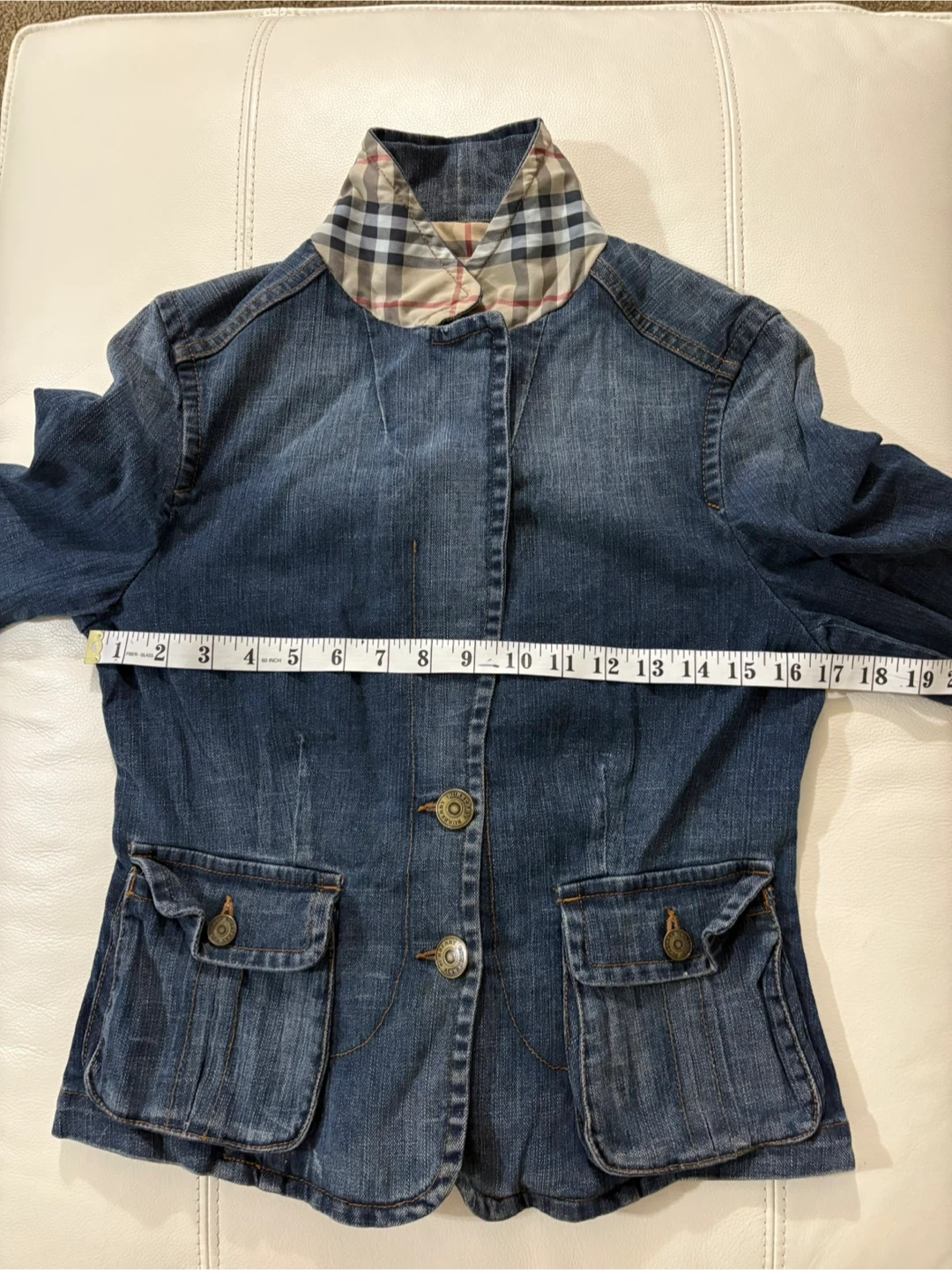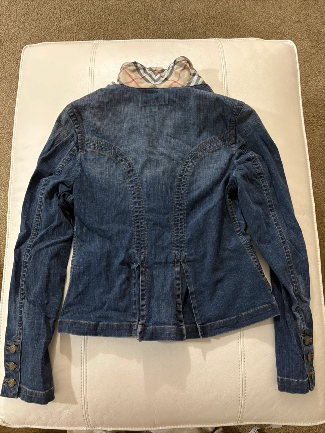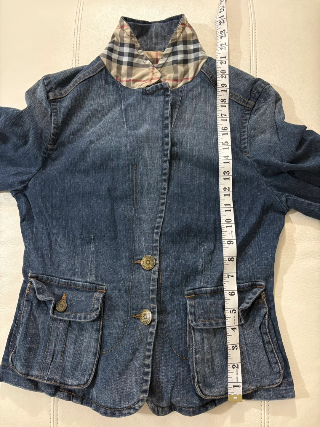Selling a stylish Burberry London denim jacket. It's a size 8 and features the classic Burberry plaid lining. A fashionable addition to any wardrobe!