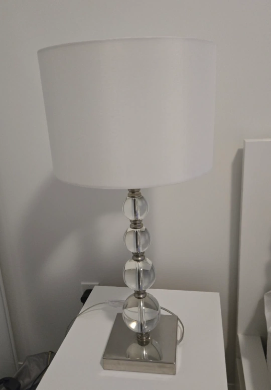Here's a stylish table lamp featuring a crystal ball design. It adds a touch of elegance to any room. The lamp has a white shade and a silver base. It's in great condition and ready to brighten up your space