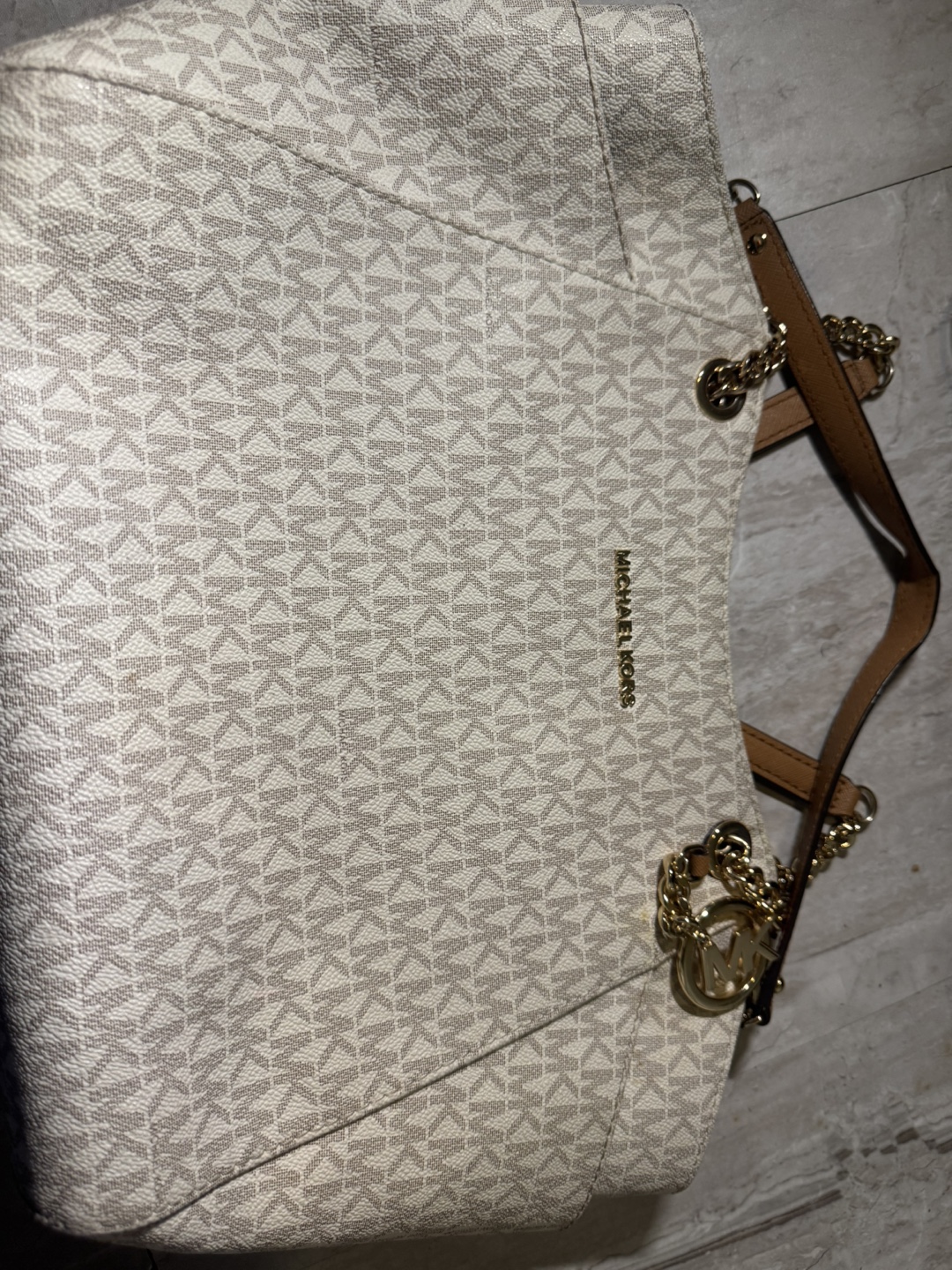 Selling a Michael Kors tote bag, features the classic MK pattern and gold-tone chain detailing.