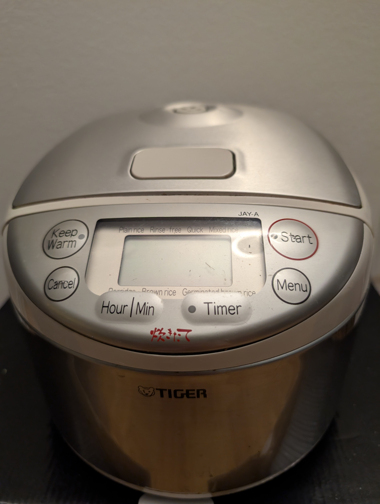 Selling a Tiger rice cooker! It's in great condition and ready to cook up some delicious rice. It has settings for plain rice, rinse-free rice, quick rice, mixed rice, brown rice, and germinated brown rice. It also has a timer function. Perfect for any kitchen!