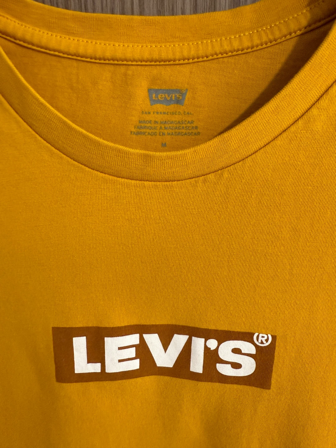 - A mustard yellow Levi's T-shirt with the classic Levi's logo