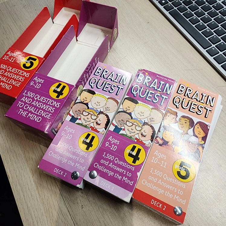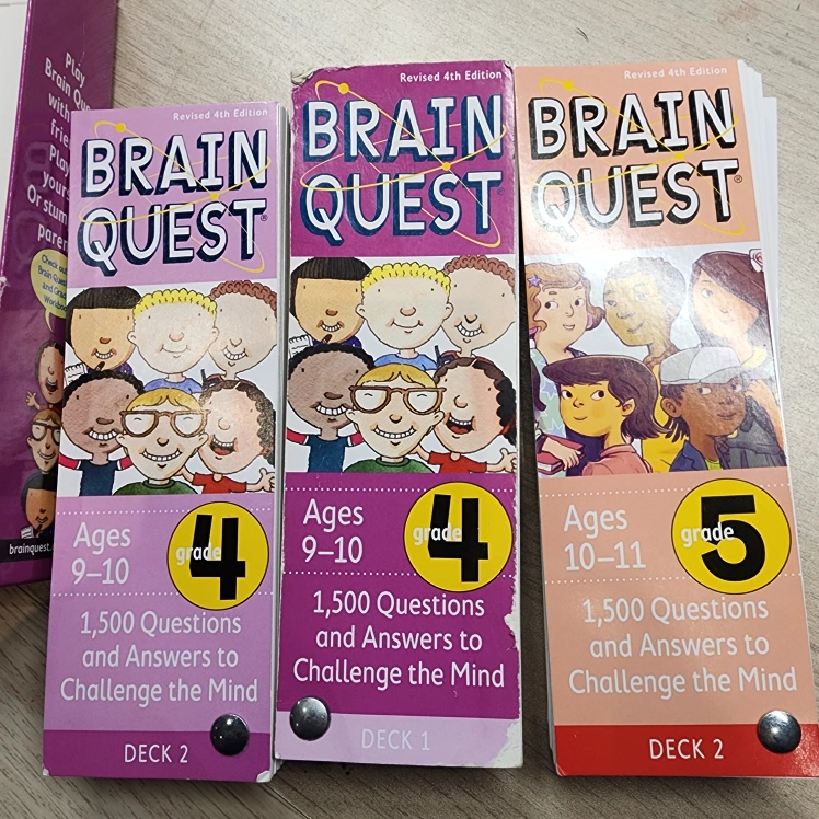 134Selling a set of Brain Quest card decks! There are two decks for Grade 4 (ages 9-10) and one deck for Grade 5 (ages 10-11). Each deck has 1,500 questions and answers to challenge the mind. Great for learning and fun! $5 for all
