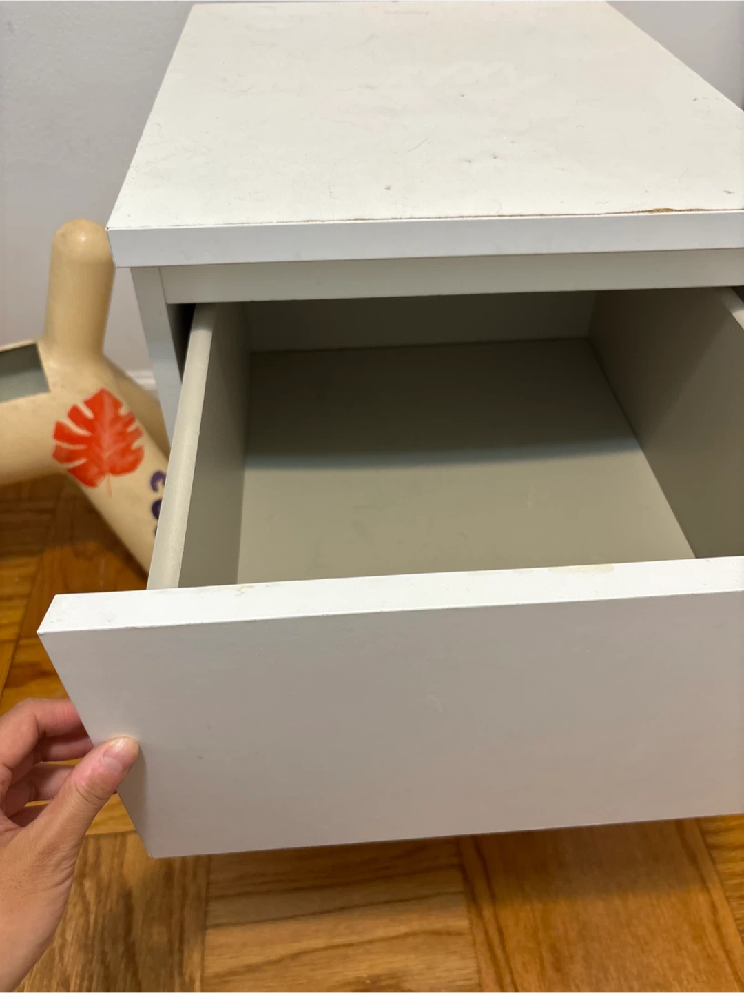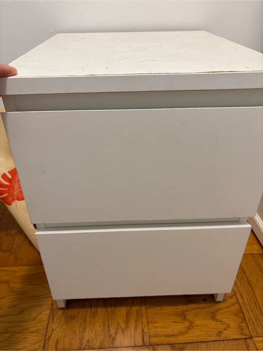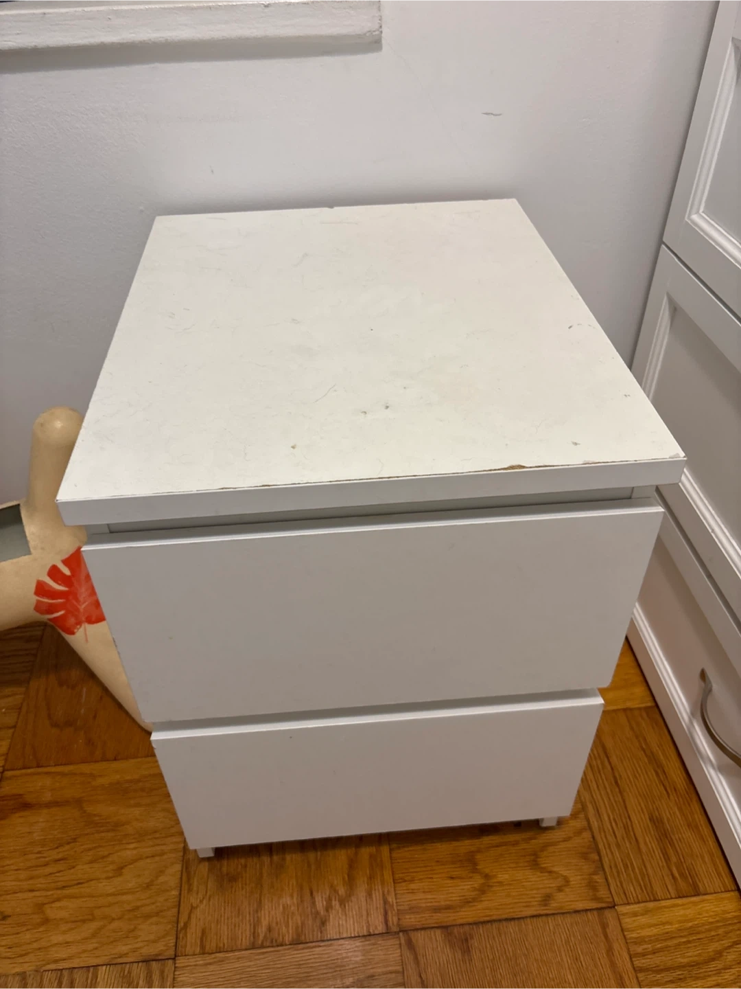 Selling a white nightstand with two drawers. It's perfect for keeping your bedside essentials organized. There are some signs of use on the top surface, but overall it's in good condition and very functional