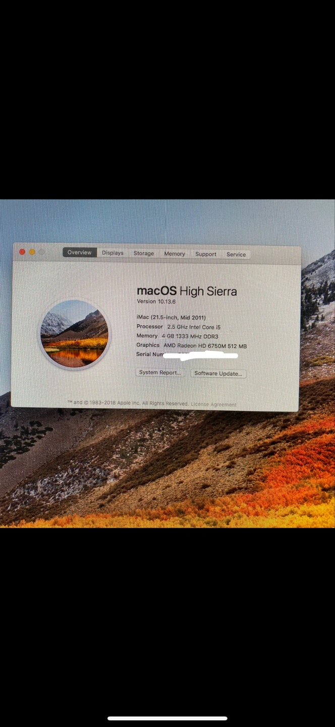 Selling an Apple iMac 21.5-inch, Mid 2011 model. It runs macOS High Sierra 10.13.6. The processor is 2.5 GHz Intel Core i5 with 4.0 GB 1333 MHz DDR3 memory and AMD Radeon HD 6750M 512 MB graphics