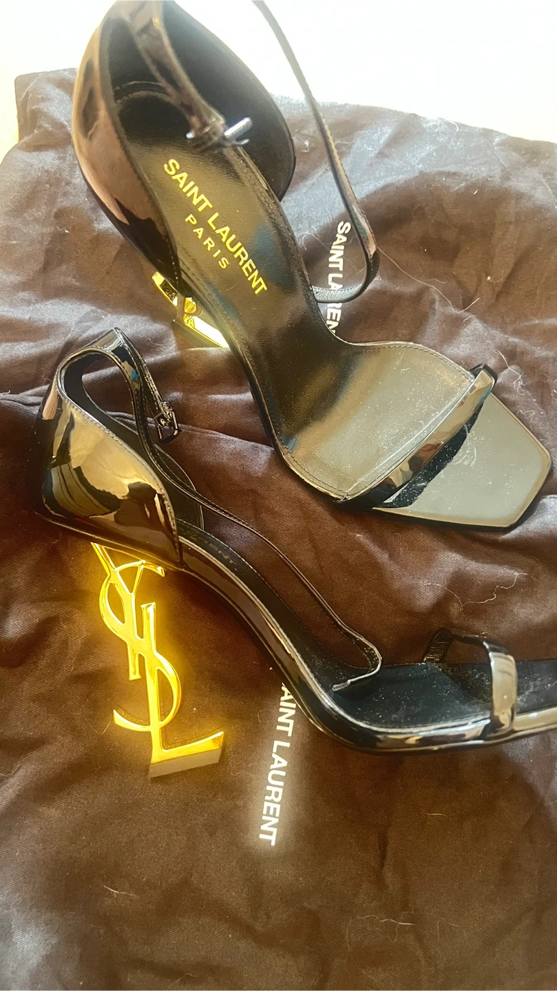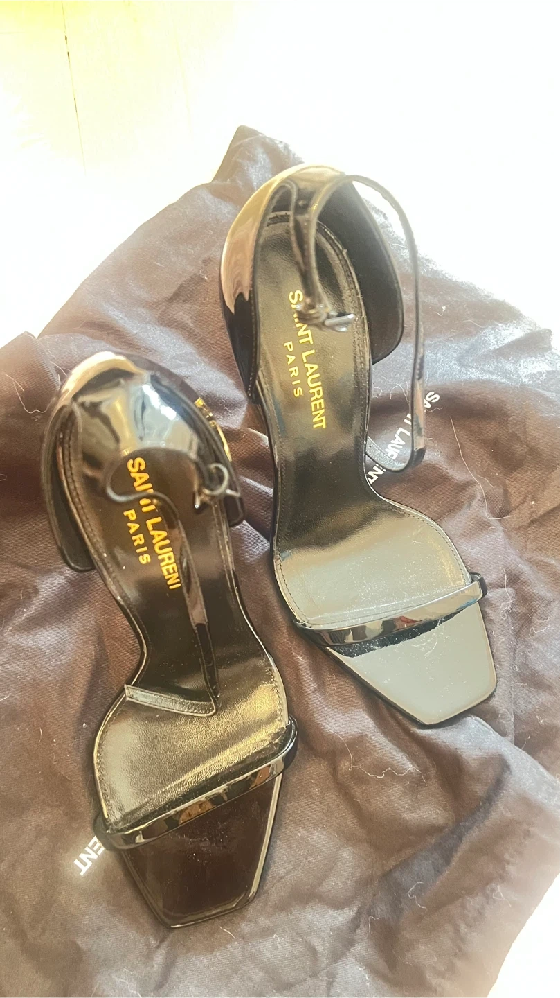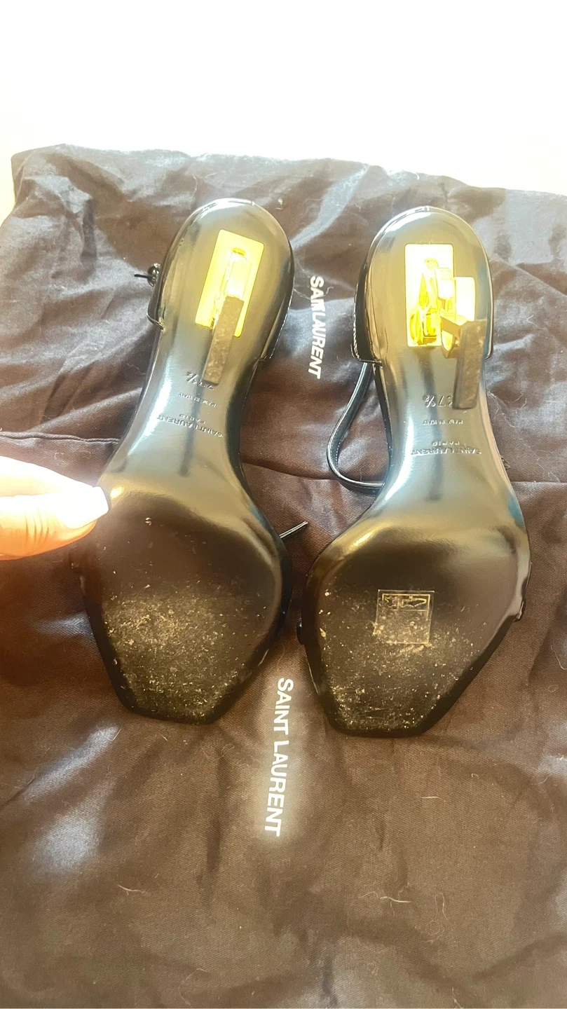 Selling a pair of Saint Laurent heels in black patent leather. They are a size 7.5. These stylish heels feature the iconic YSL logo on the heel. They are in good condition and come with the original dust bag