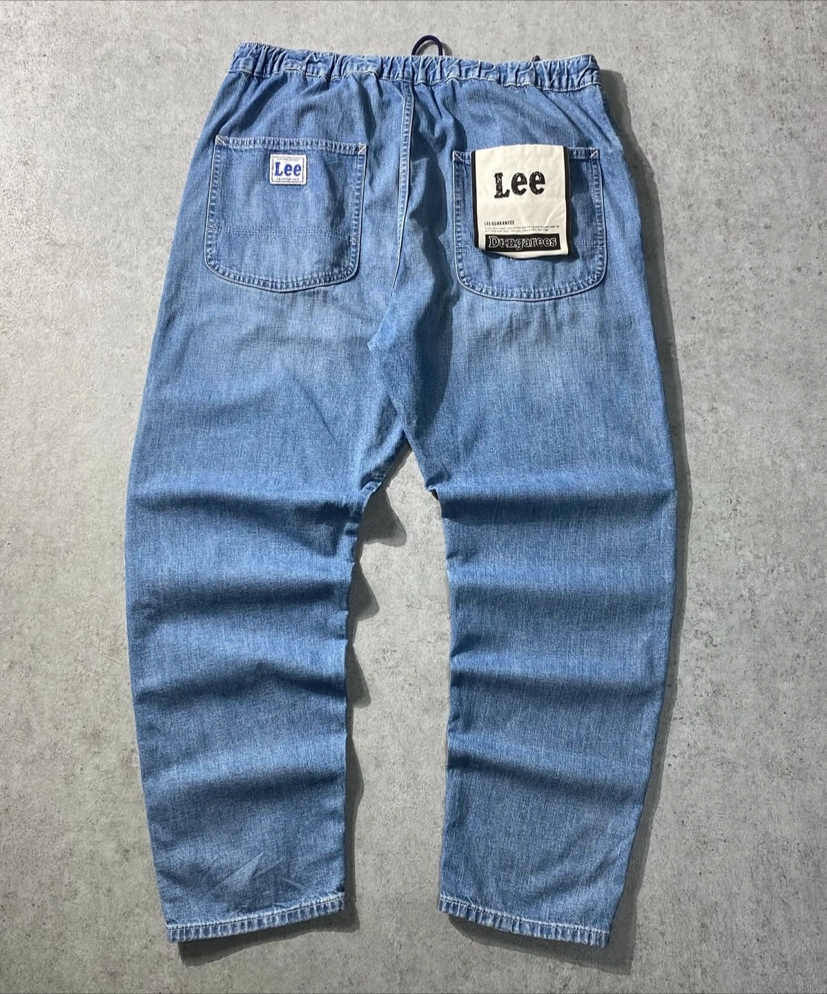A rare vintage Lee dungarees denim pants from the 1990s. Designed with a relaxed fit, elastic waistband with drawstring, and practical back patch pockets including signature Lee branding. A perfect mix of workwear durability and retro streetwear style, ideal for casual everyday outfits or collectors of vintage denim.