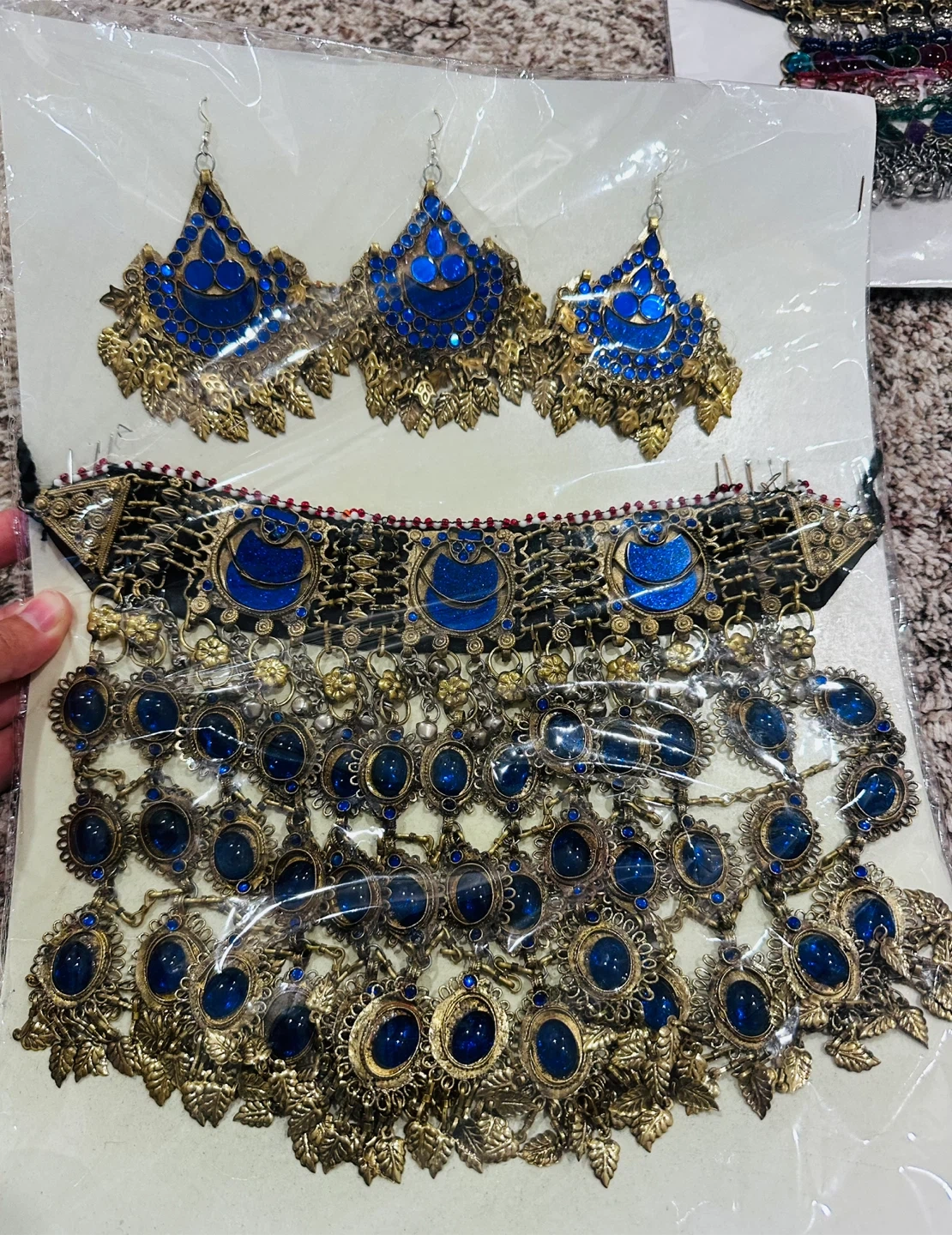 Beautiful afghani necklace and earring set featuring blue and gold detailing! Perfect for adding a touch of elegance to any outfit